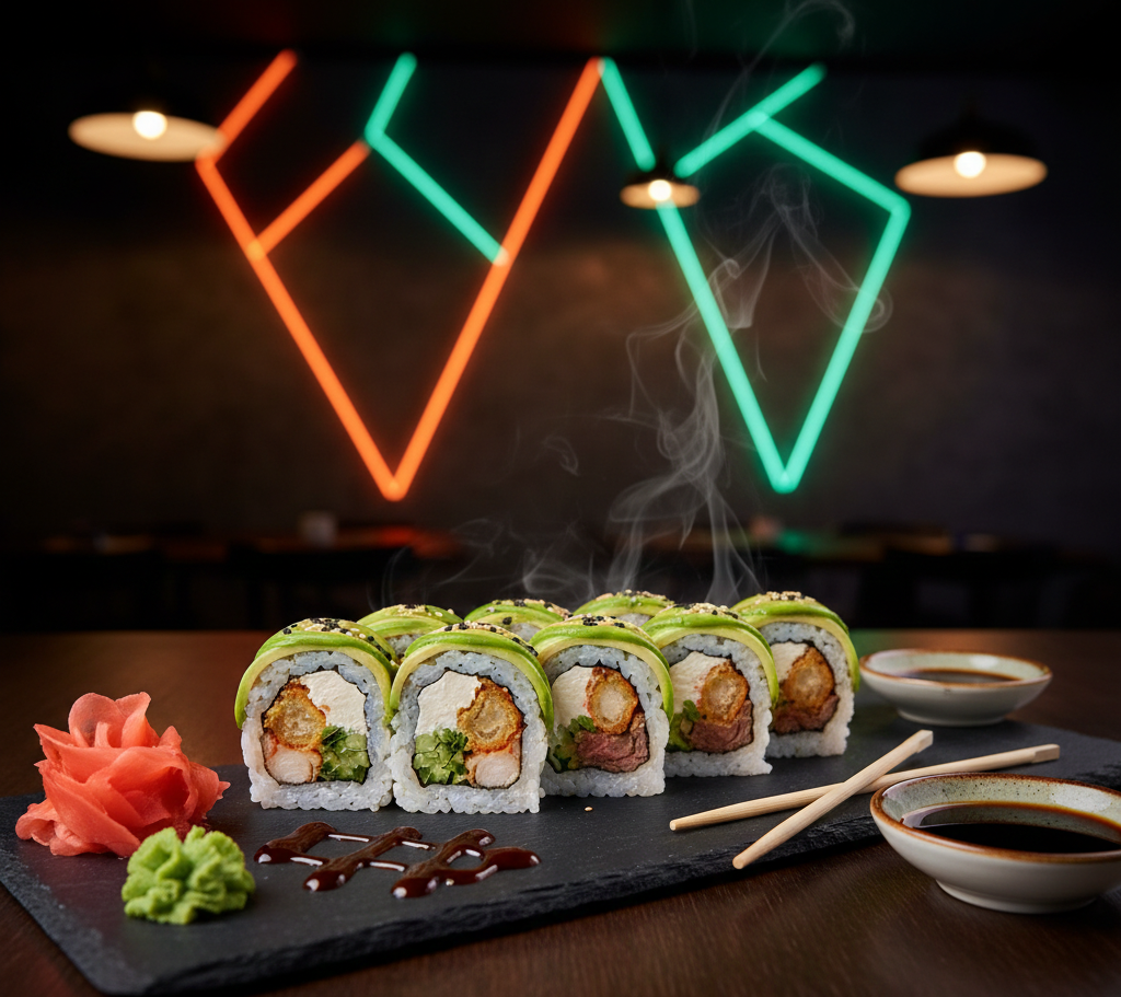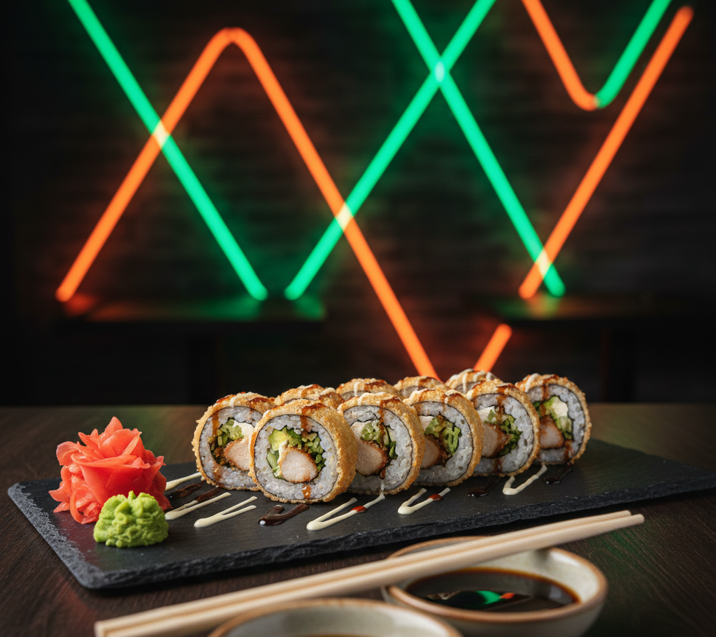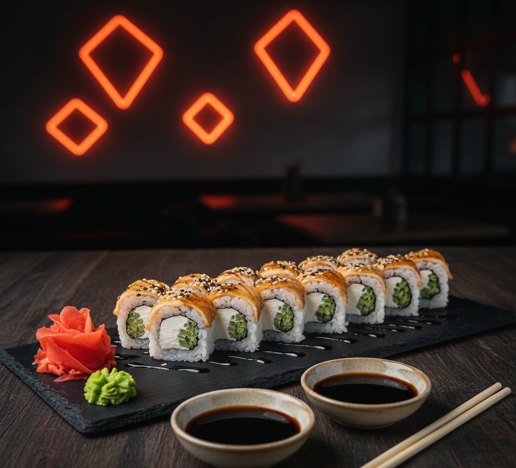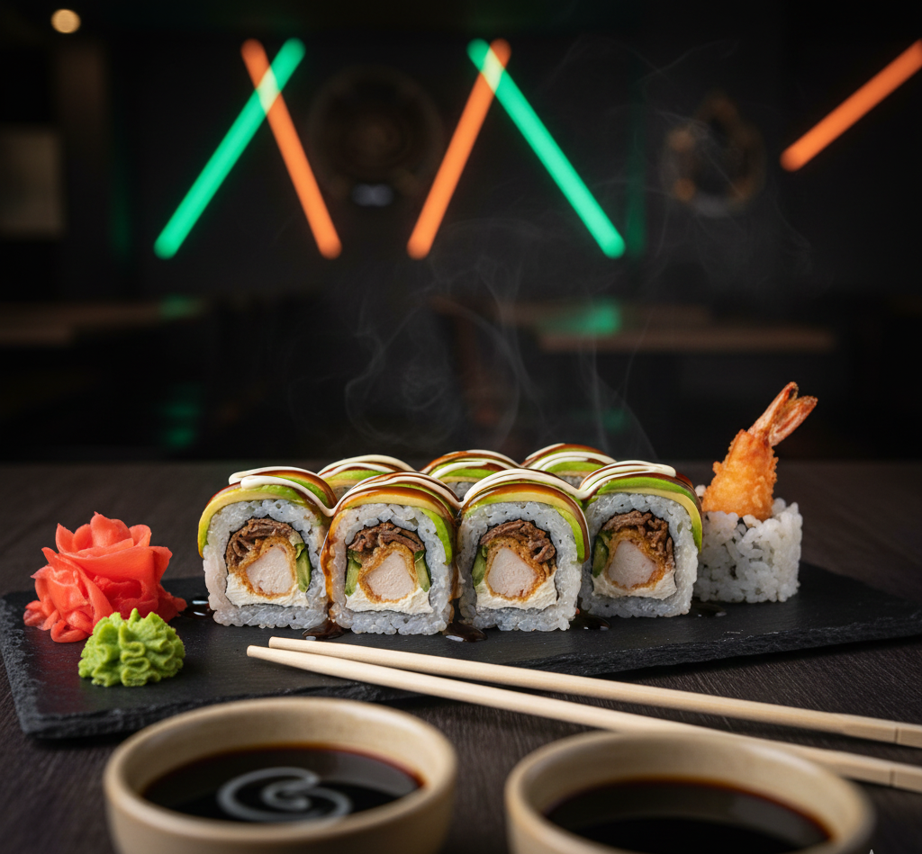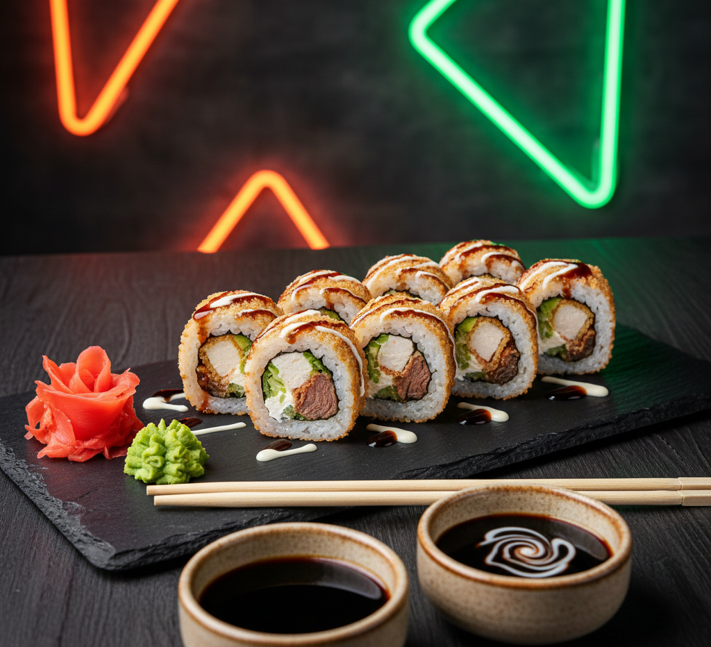 Deliciosas 10 Pzs de Aguacate, pepino, queso crema, pollo, teriyaki, tempura. Acompañada con salsa de soya y salsa de anguila