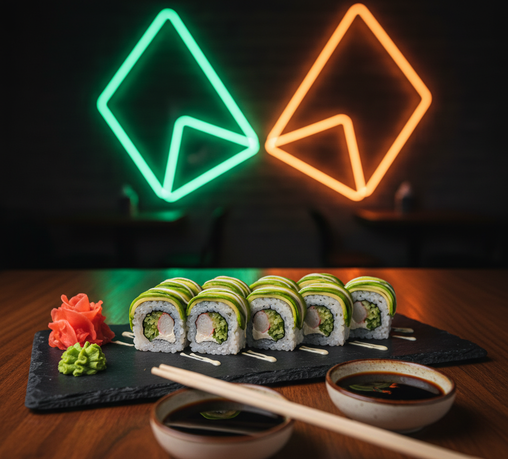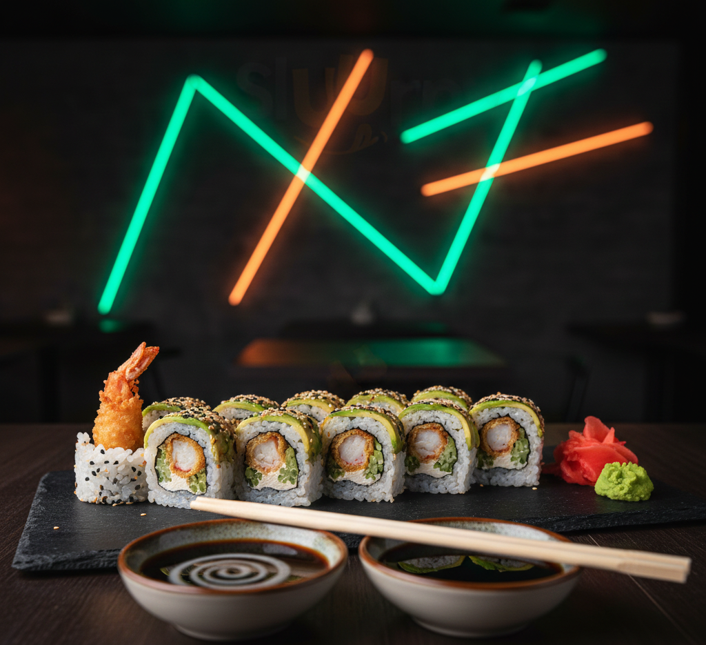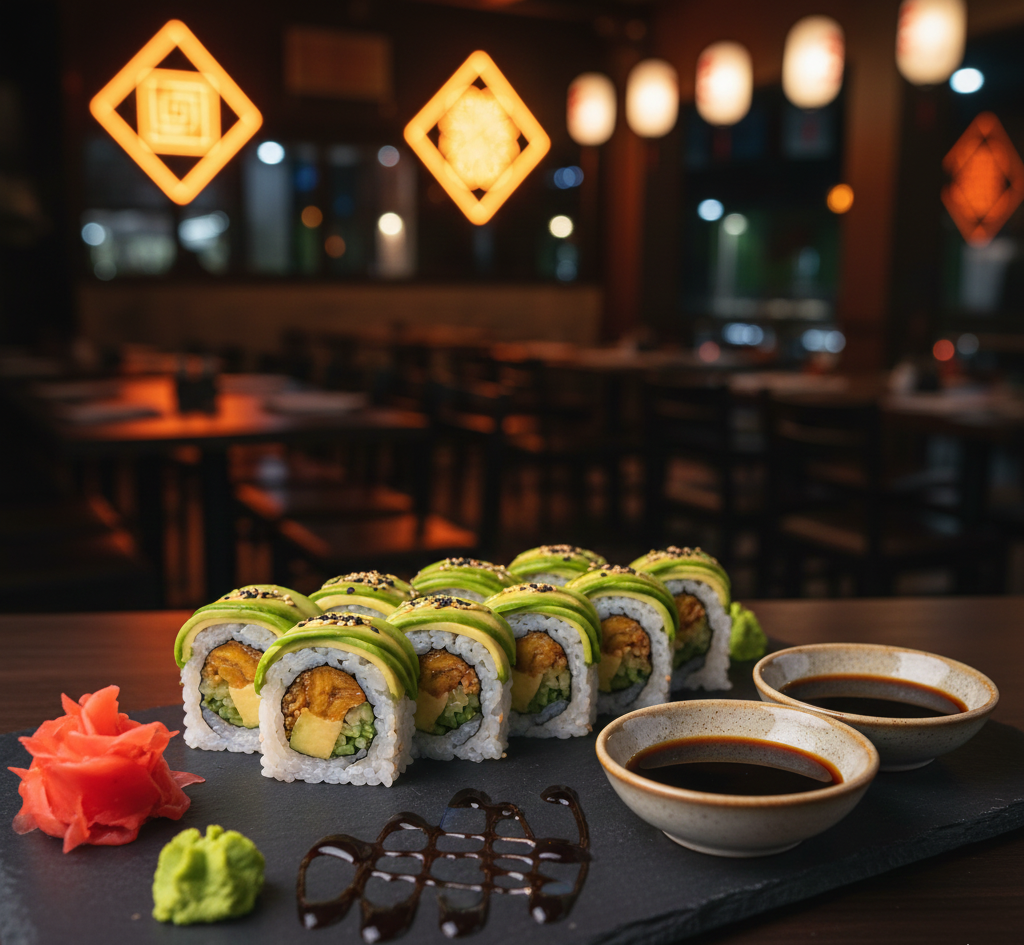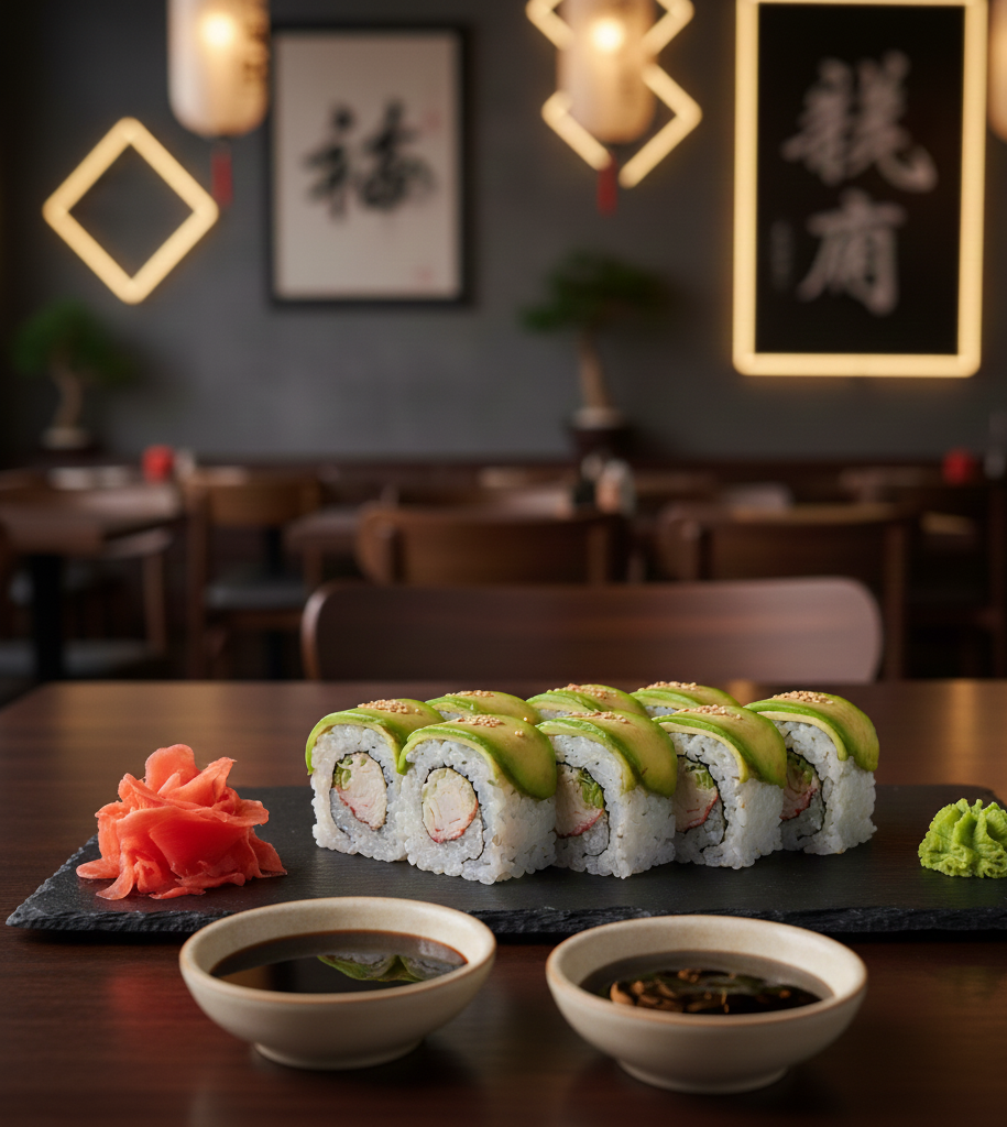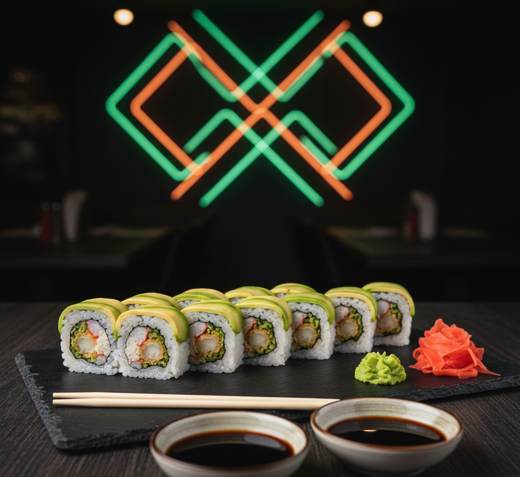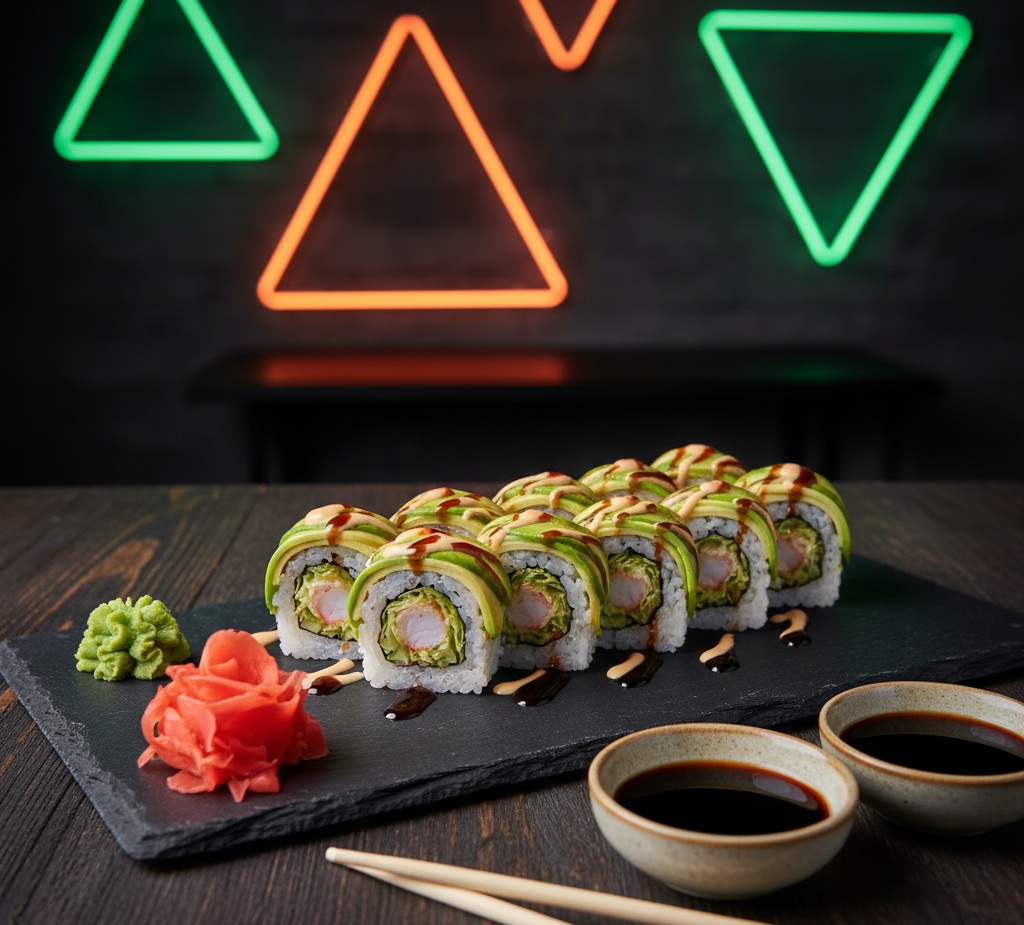 Deliciosas 10 Pzs de Aguacate, pepino, lechuga, camarón, aguacate, mayonesa, spicy. Acompañada con salsa de soya y salsa de anguila