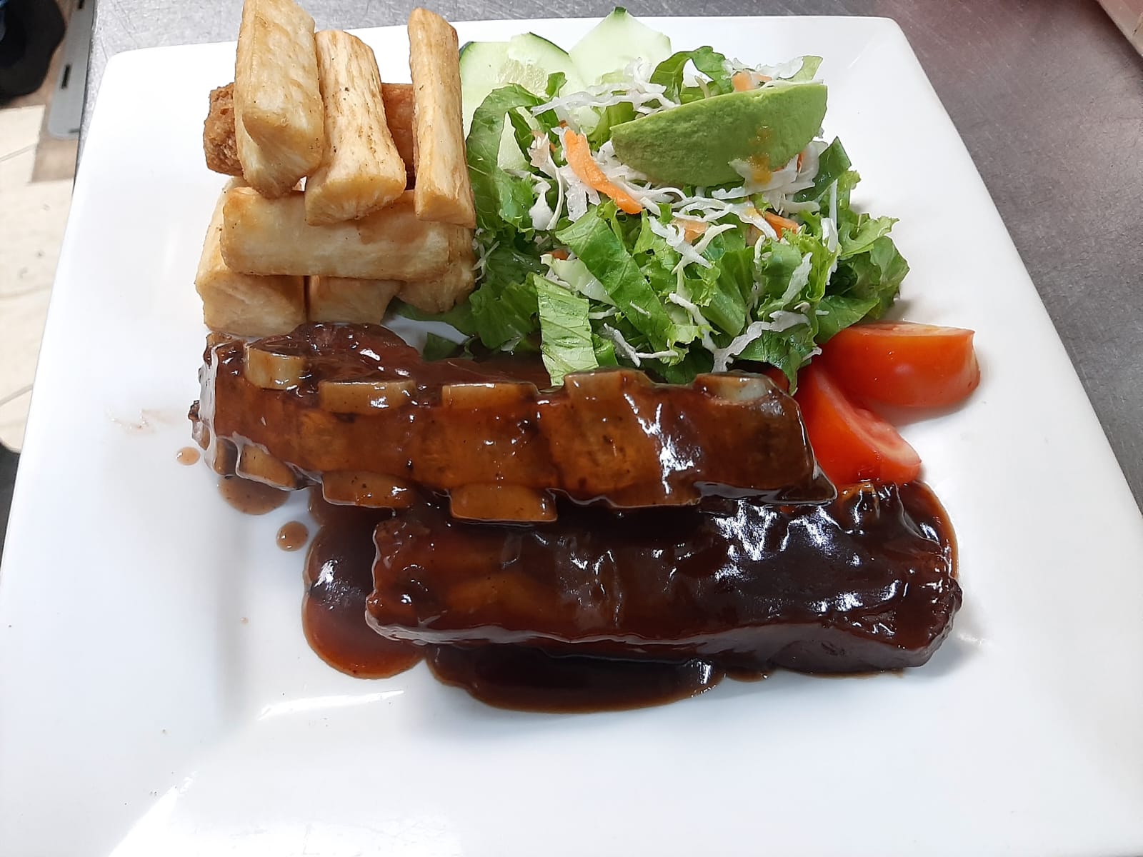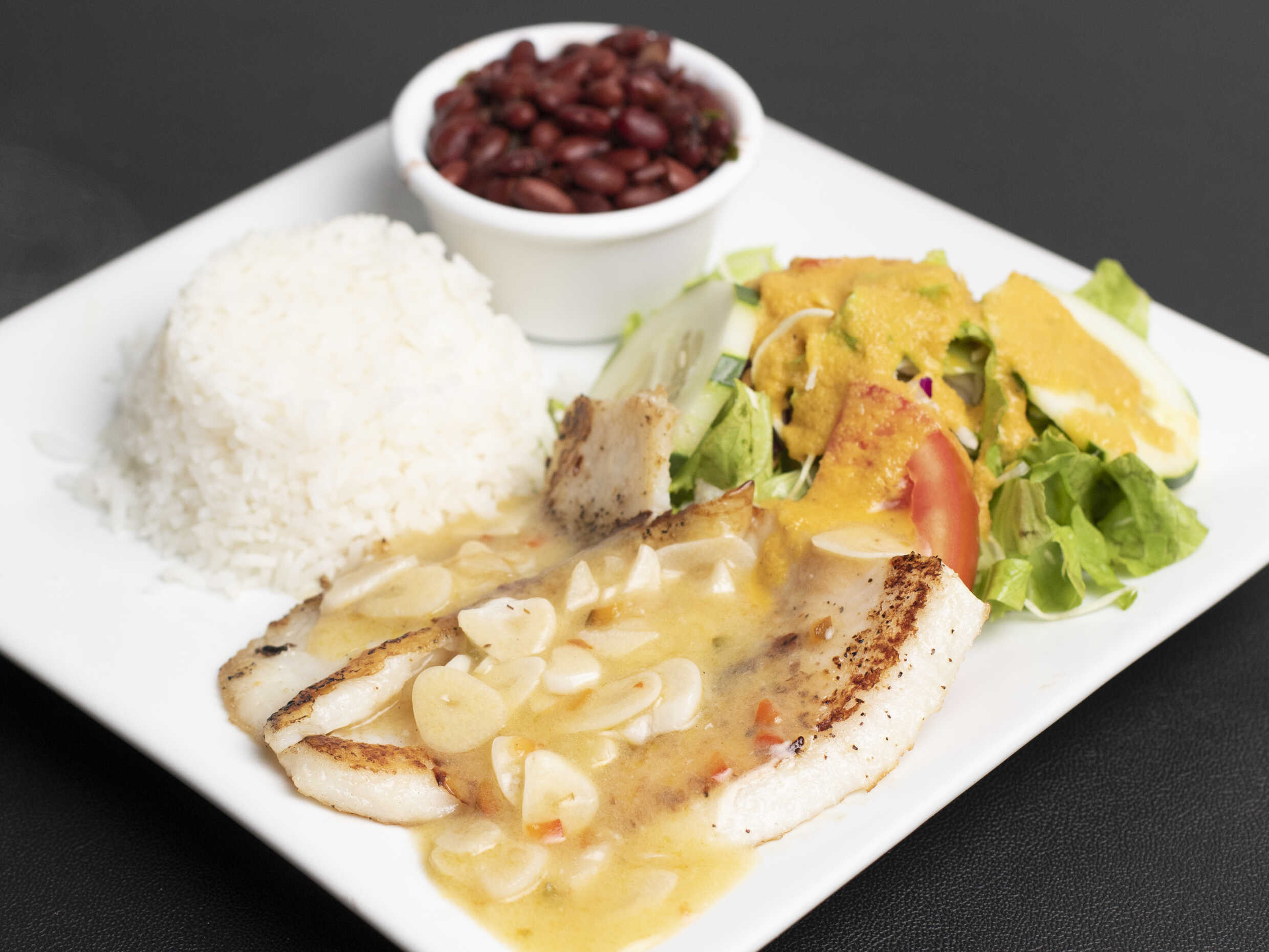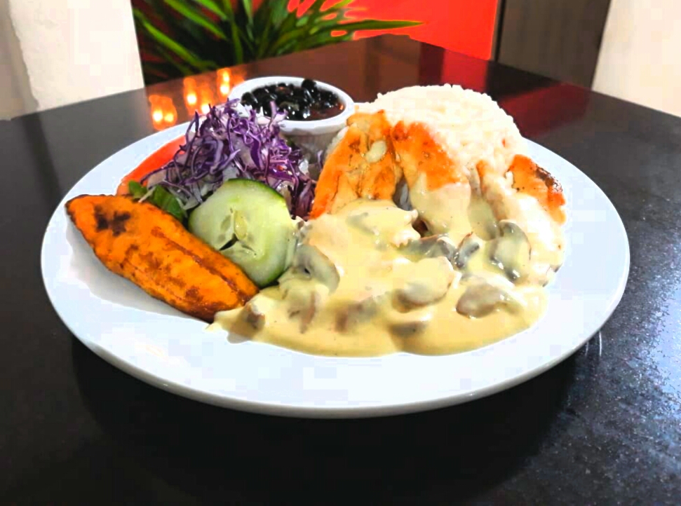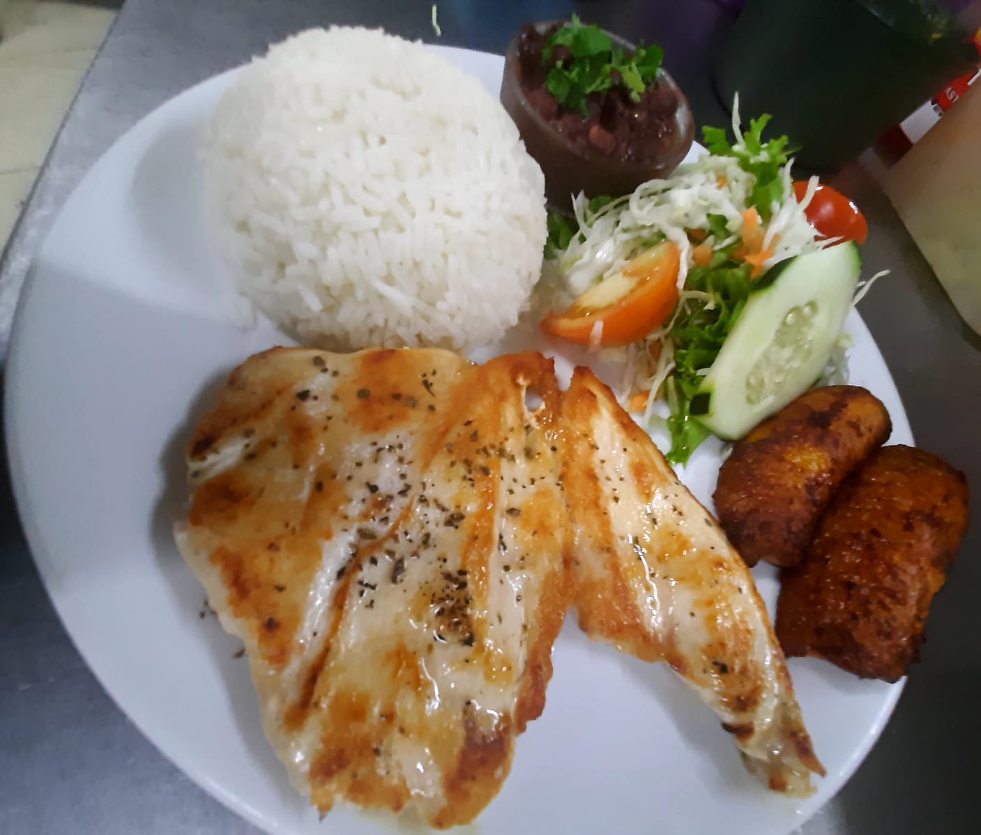Arroz, frijoles, ensalada verde, plátano maduro y una rica proteína