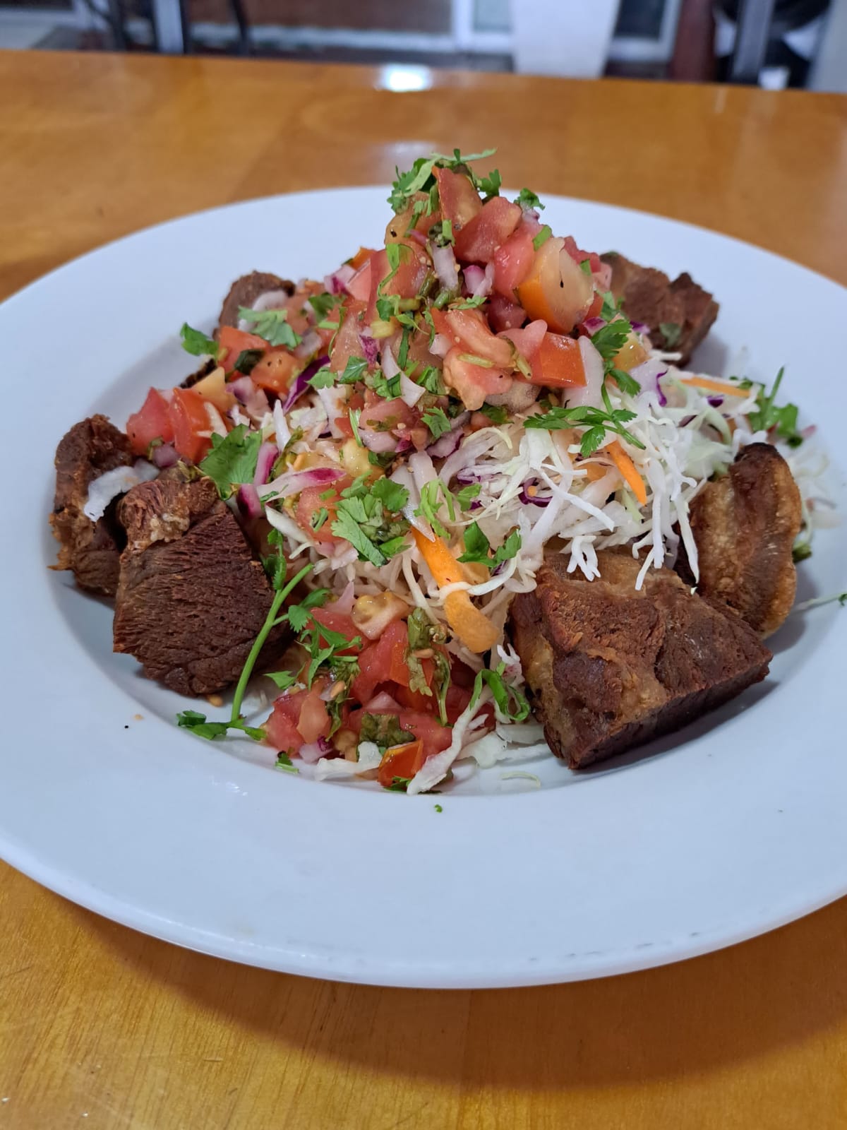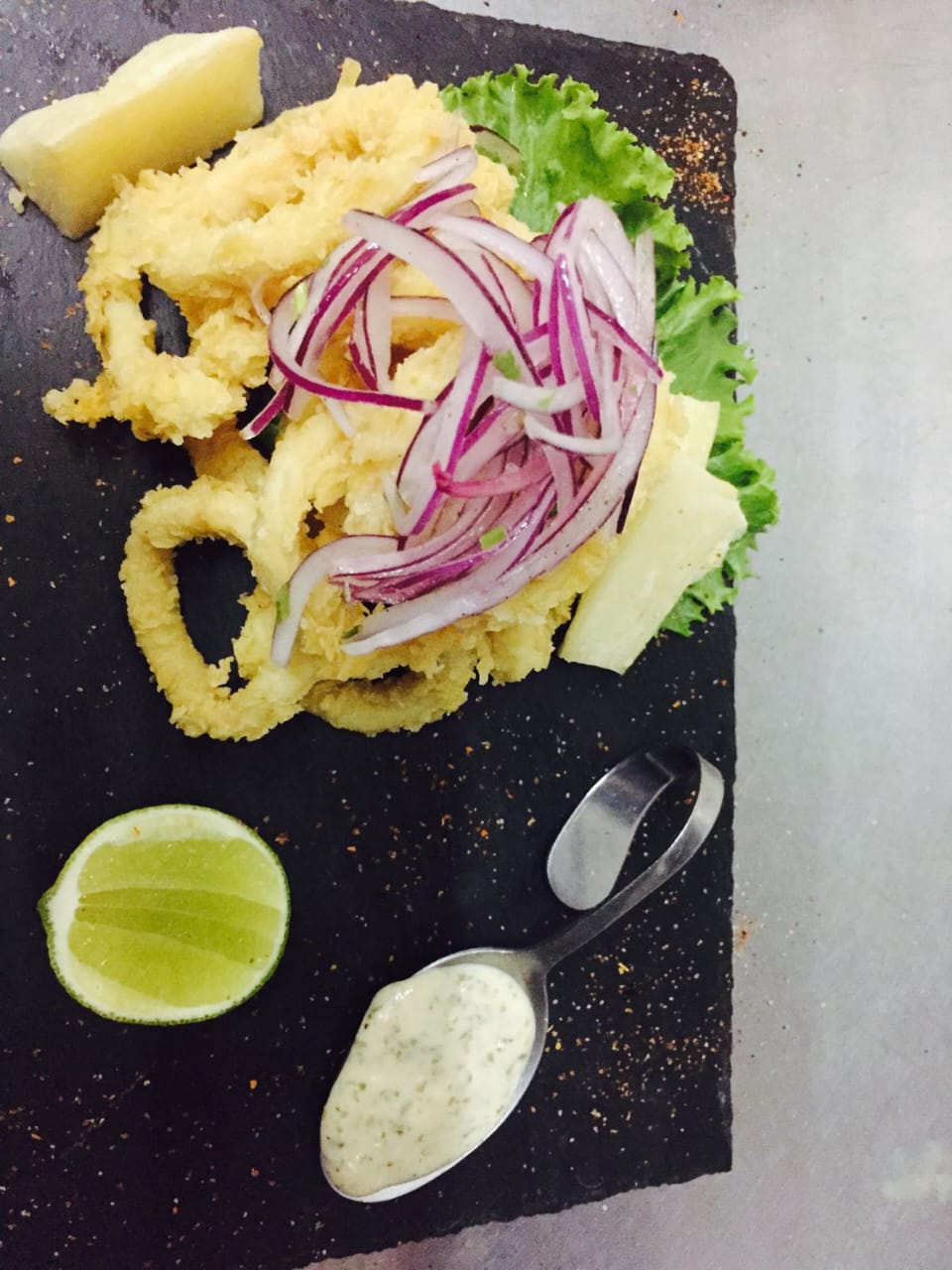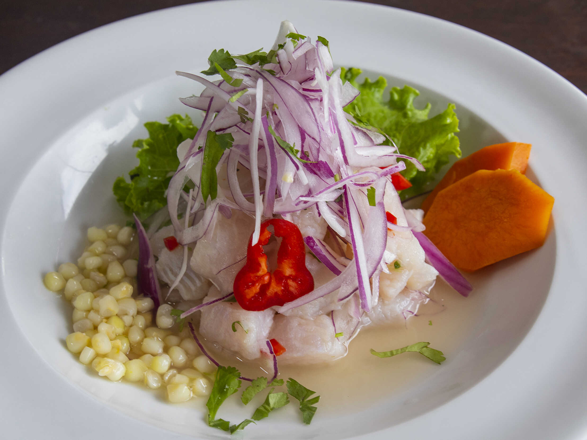 Pescado a la planta bañado en salsa chorrillana con ají amarillo, cebolla y tomates.