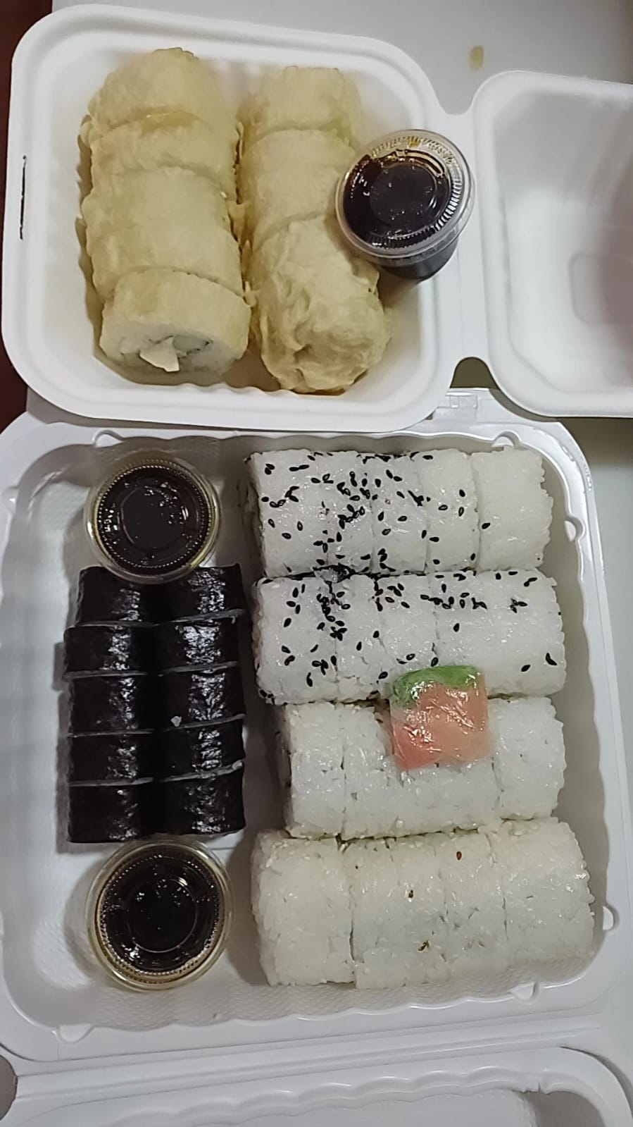 Kani tempura, maki de pepino, California roll, Rosy roll. 2 salsas de soja 1 salsa de anguila