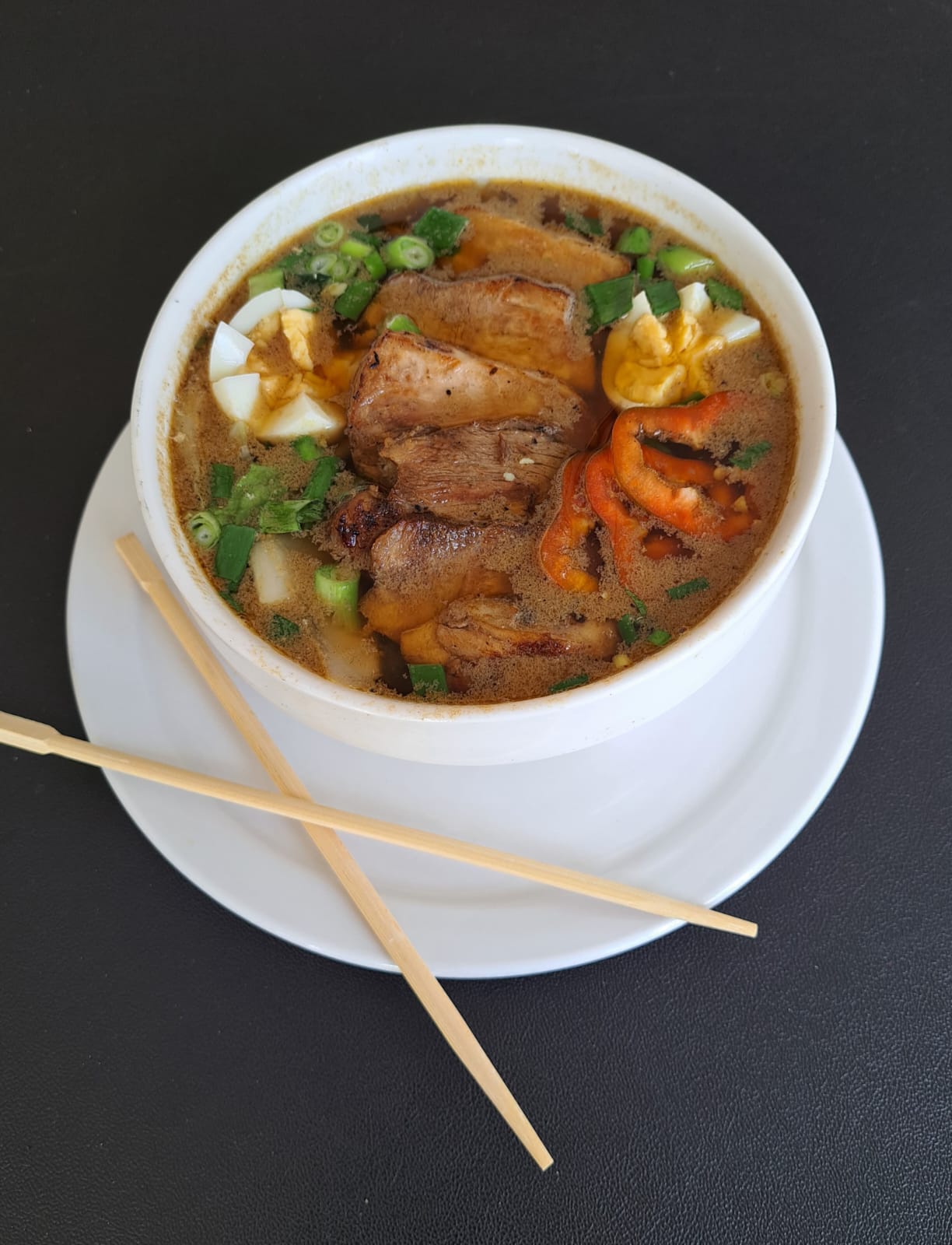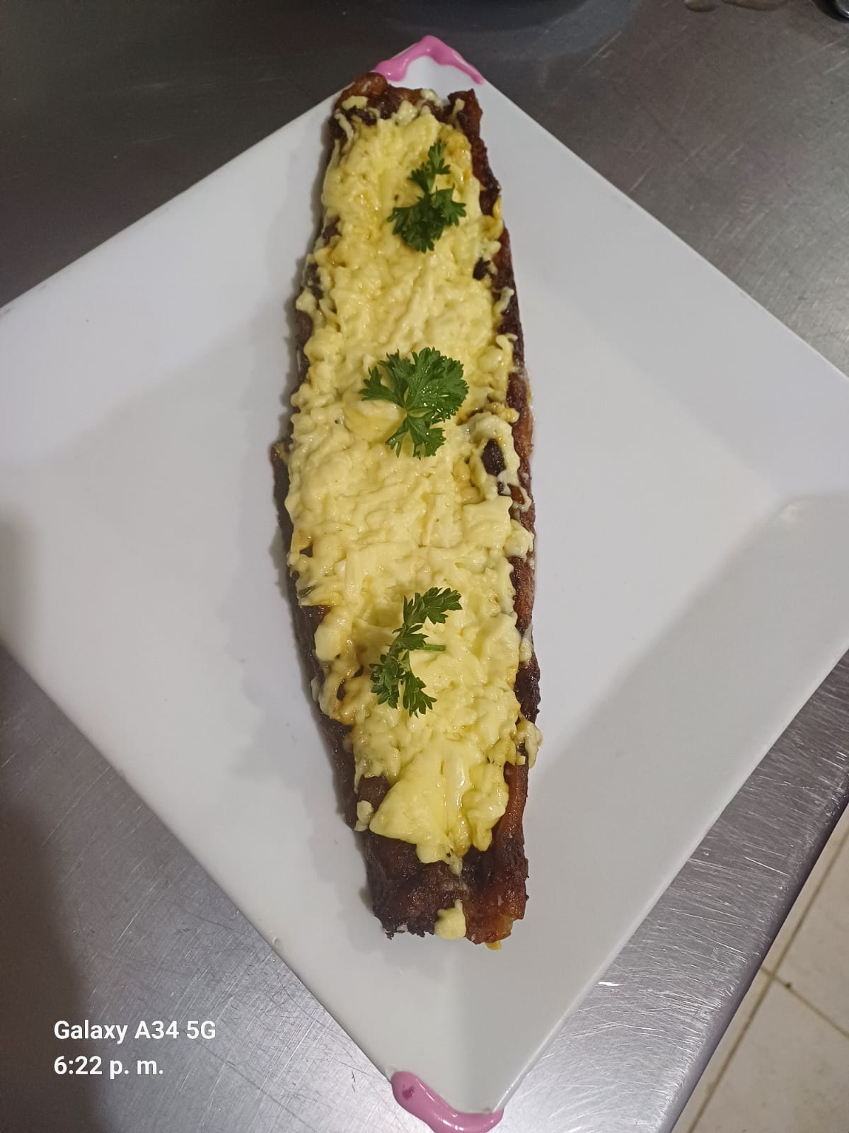 Relleno de salmón, aguacate y queso crema. Cubierto de plátano maduro y tempurizado bañado en salsa de anguila.