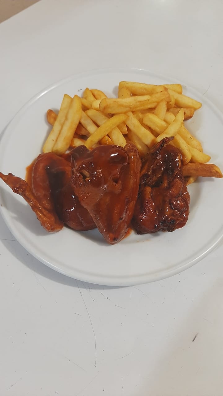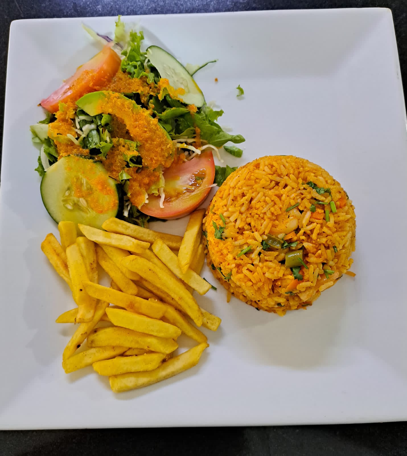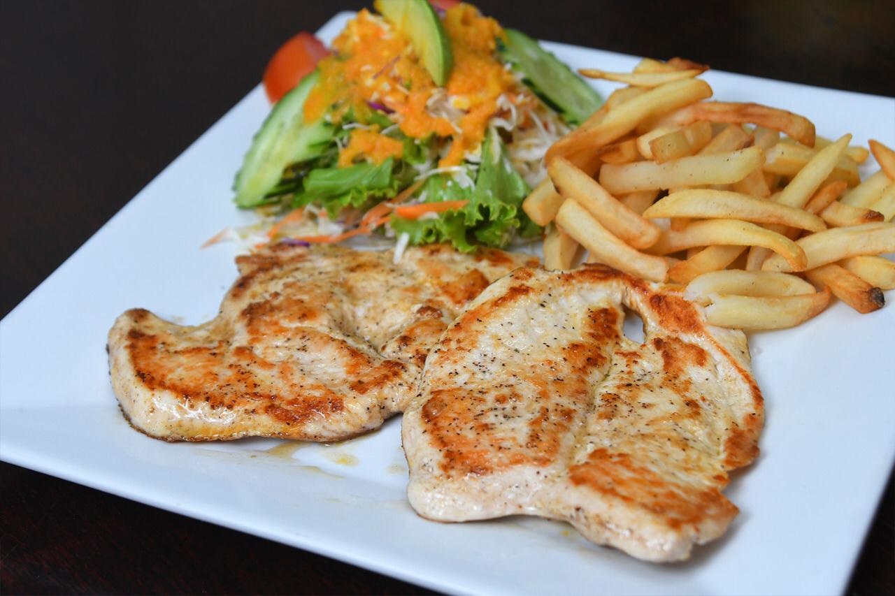 Contiene pollo, res, cerdo, huevo, mostaza china, chile dulce y cebollino con papas a la francesa y ensalada.