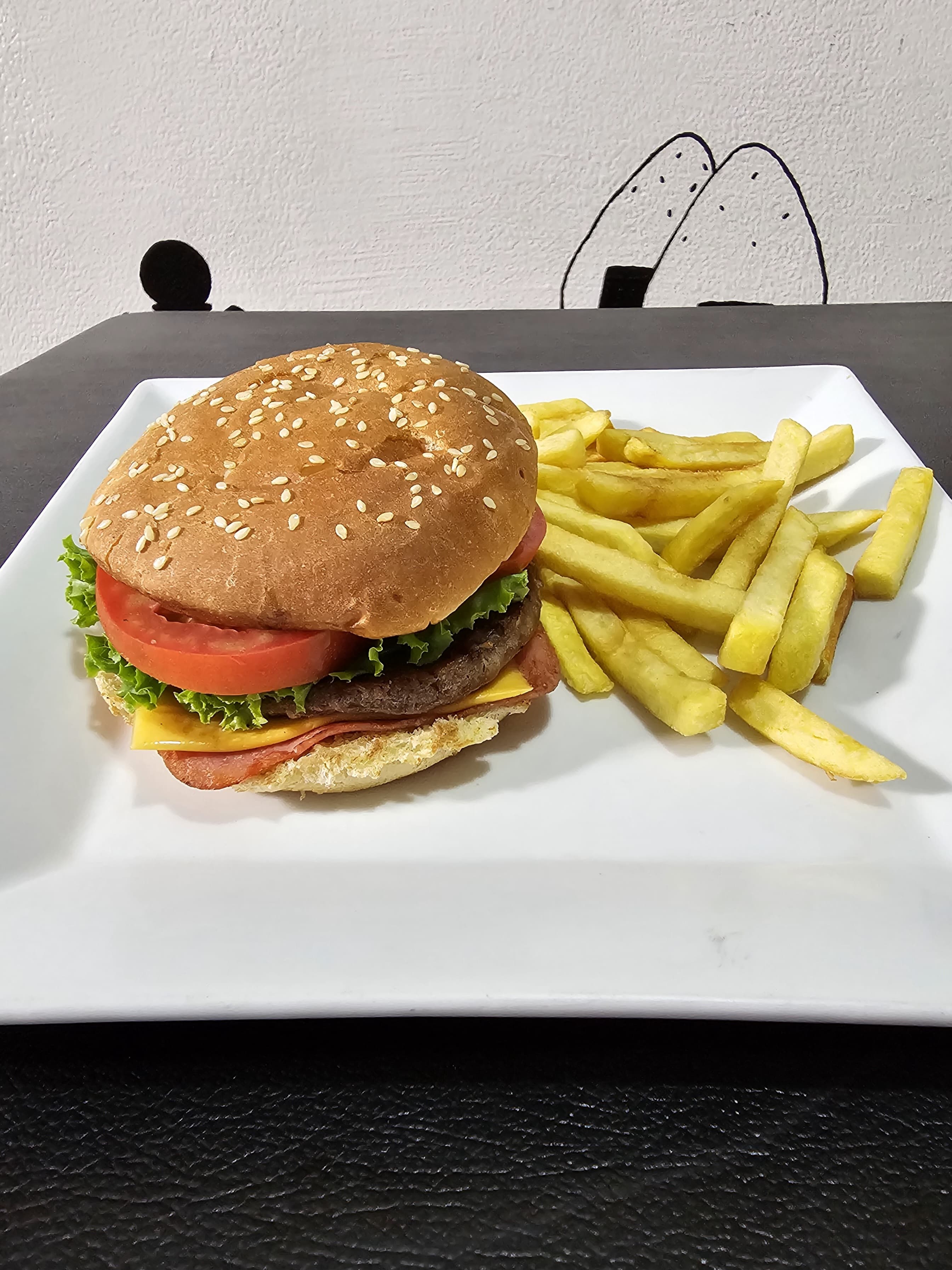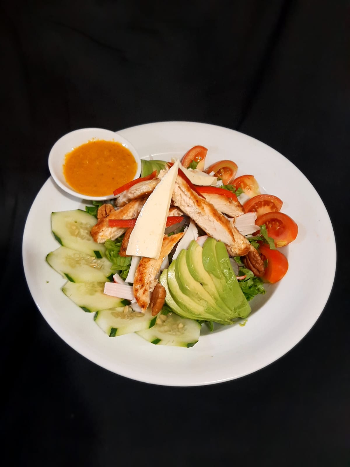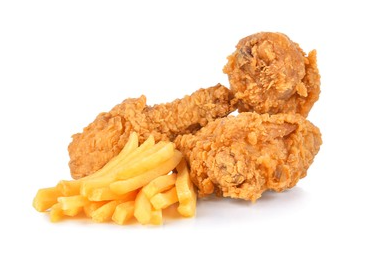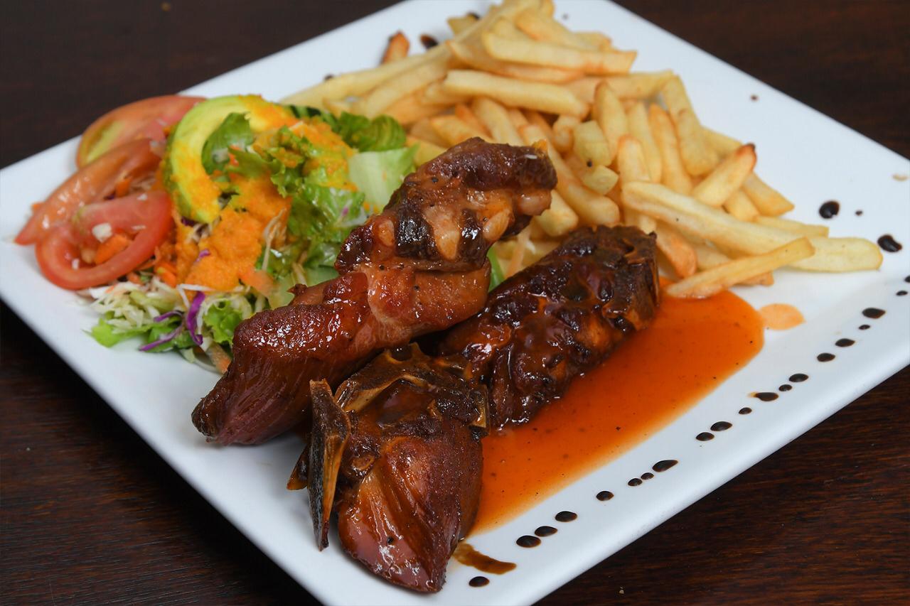 Contiene pollo, res, cerdo, huevo, mostaza china, chile dulce y cebollino con papas a la francesa y ensalada.