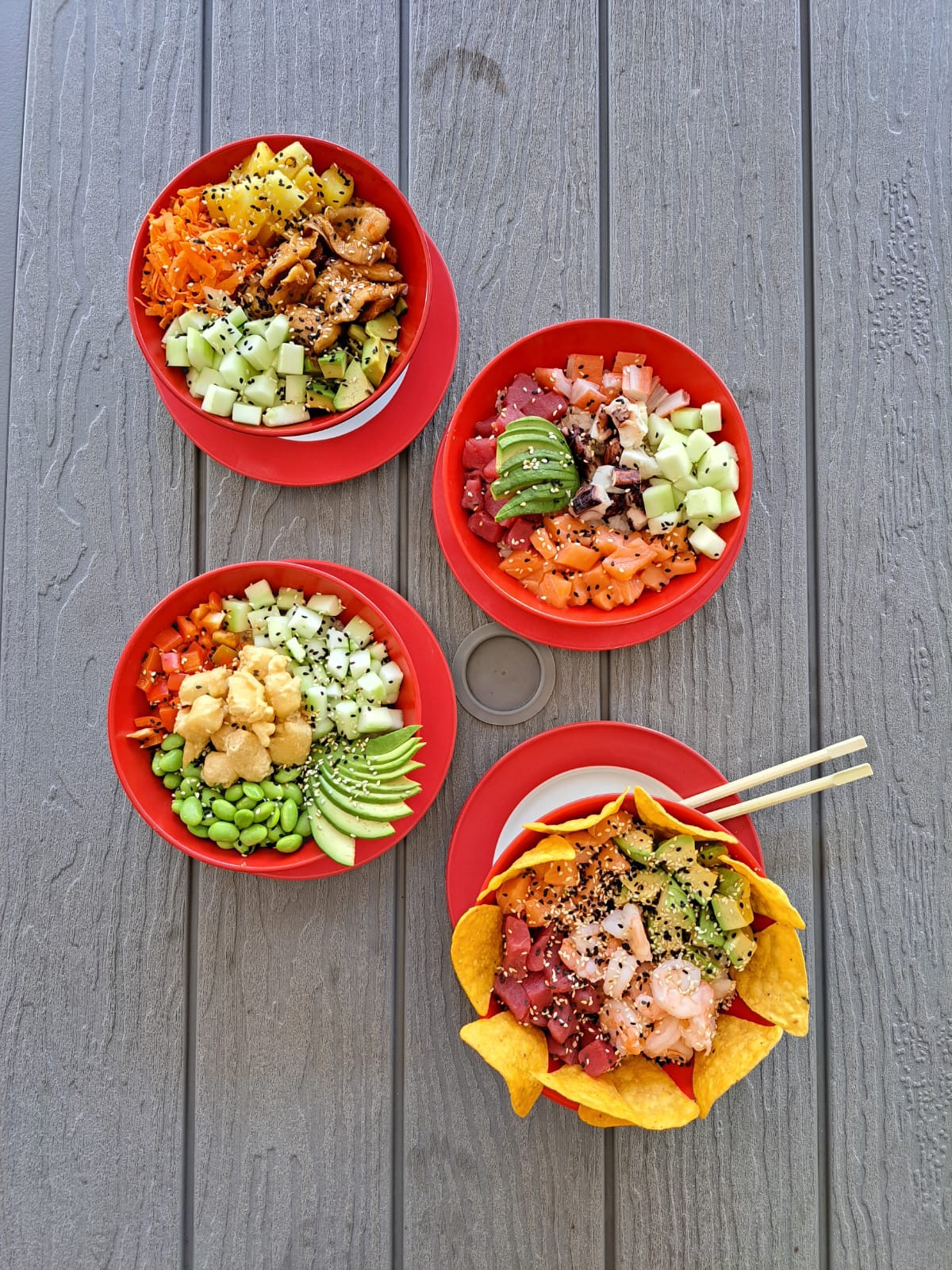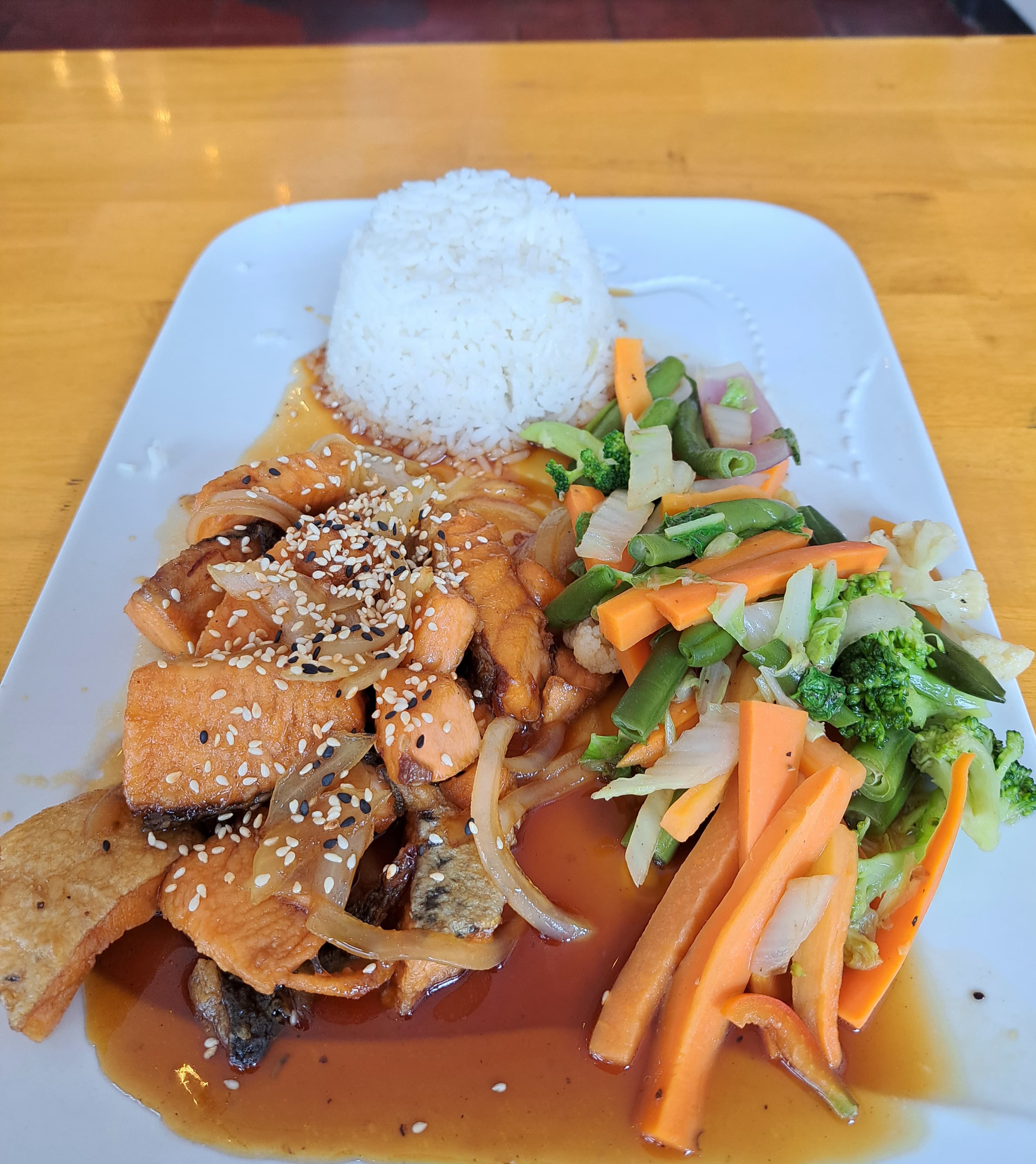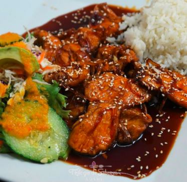 Base de arroz, salmón o atún teriyaki, aguacate, zanahoria, pepino y piña.