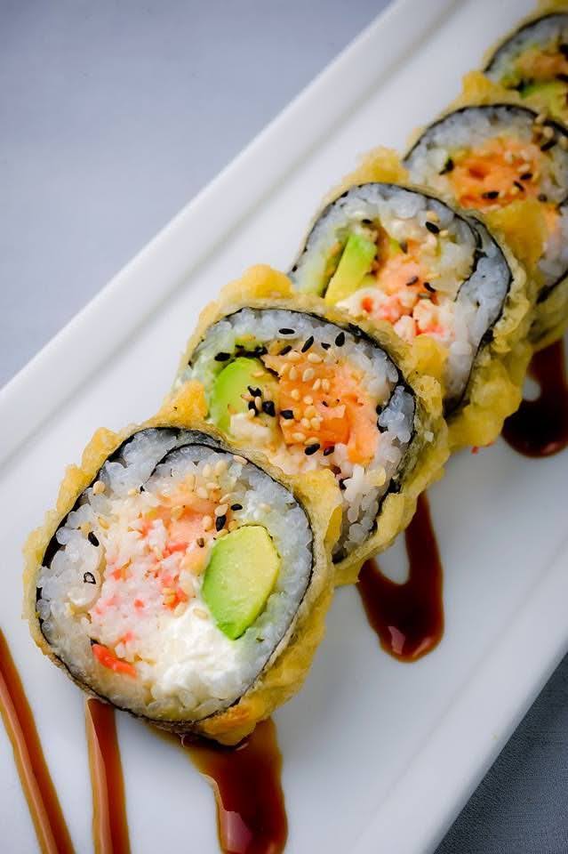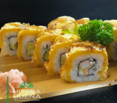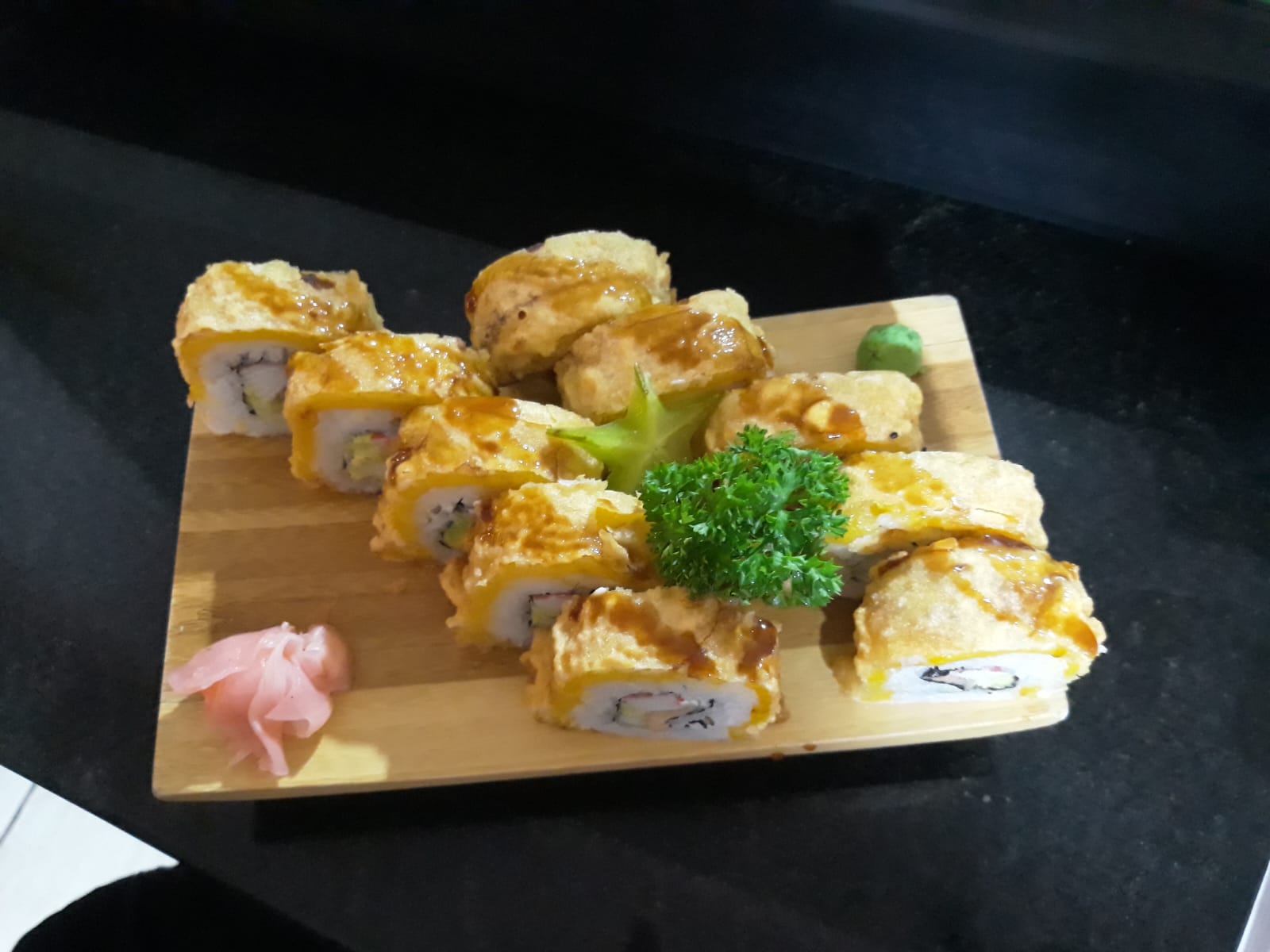 Con el alga por fuera y tempurizado, relleno de salmón, cangrejo, aguacate y queso crema. Roll tempura con alga por fuera y salsa anguila. Relleno de salmón, queso crema, aguacate y surimi.