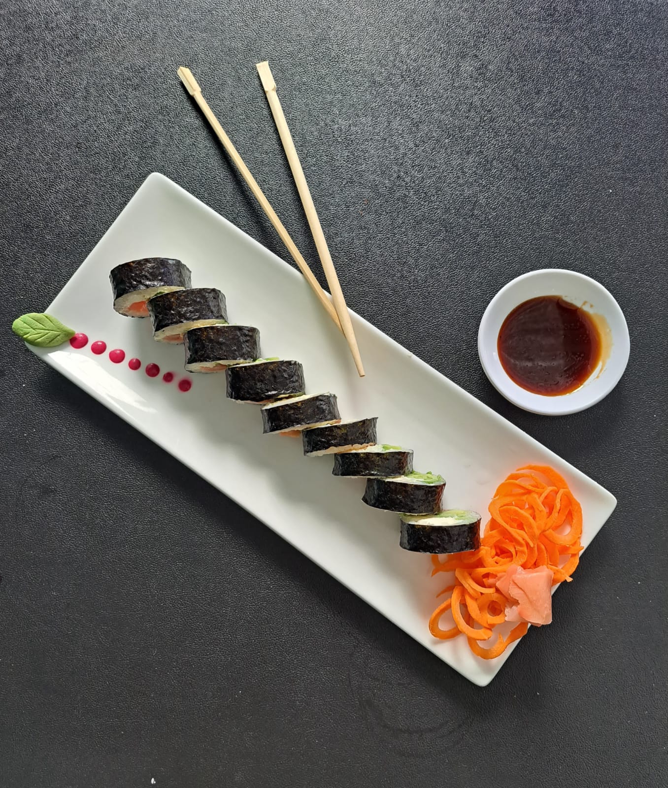 Roll grande, relleno de aguacate, pepino, plátano, zanahoria, lechuga y jengibre.