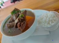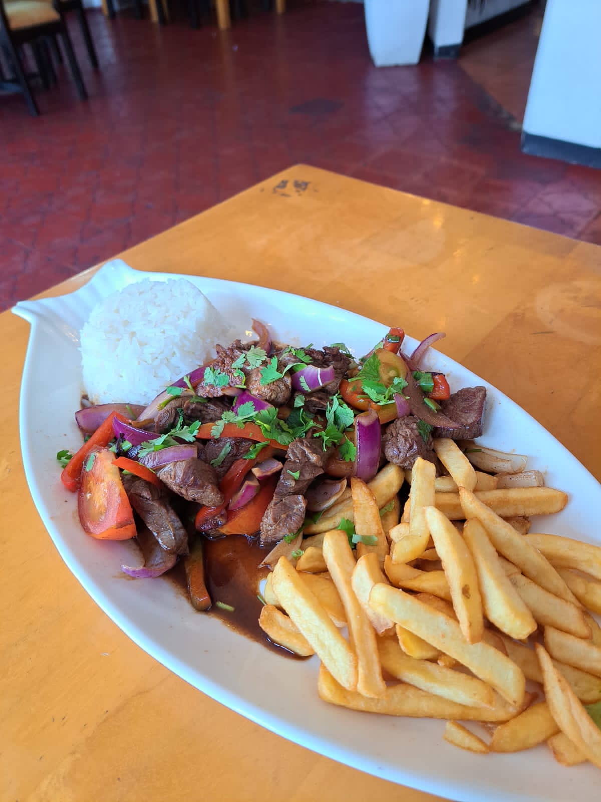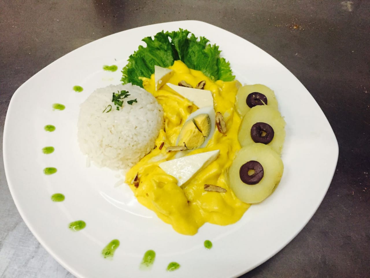 Guisado peruano con pollo mechado, papas al vapor, arroz blanco, huevo duro y queso blanco.