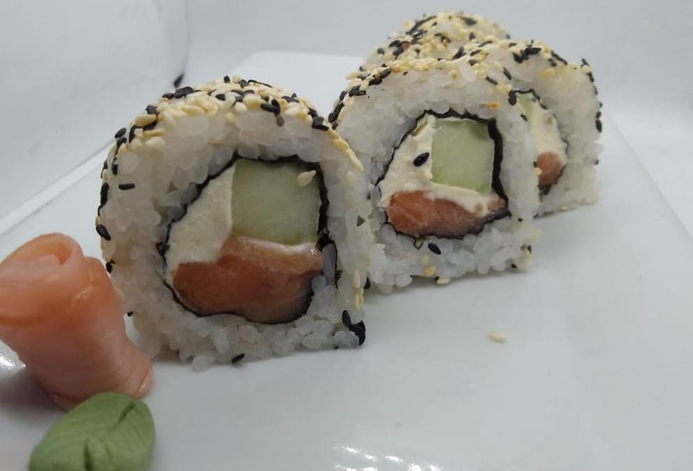 Relleno de salmón, queso crema y pepino y cubierto de semillas de ajonjolís. Cubierto de ajonjolís.