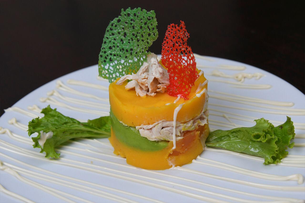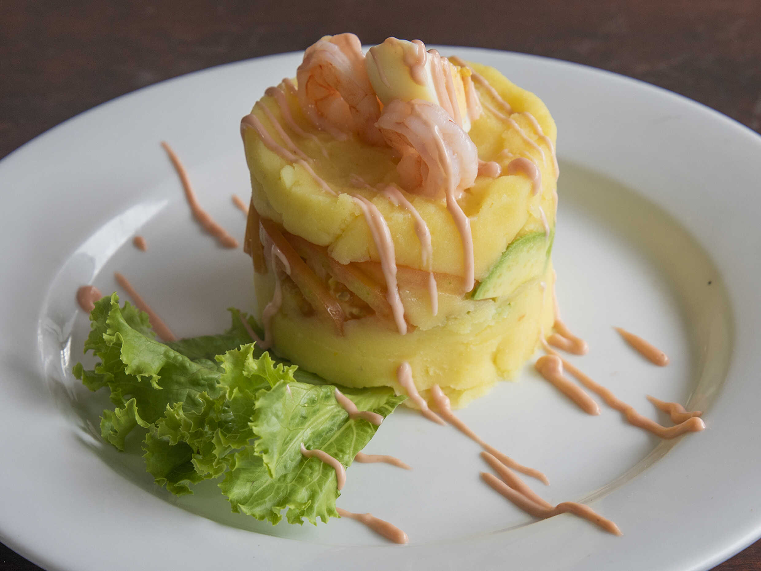 Tradicional aperitivo peruano, a base de pura de para amarilla con toque de ají amarillo y limón. Rellena de aguacate, tomates y camarón en salsa rosada.