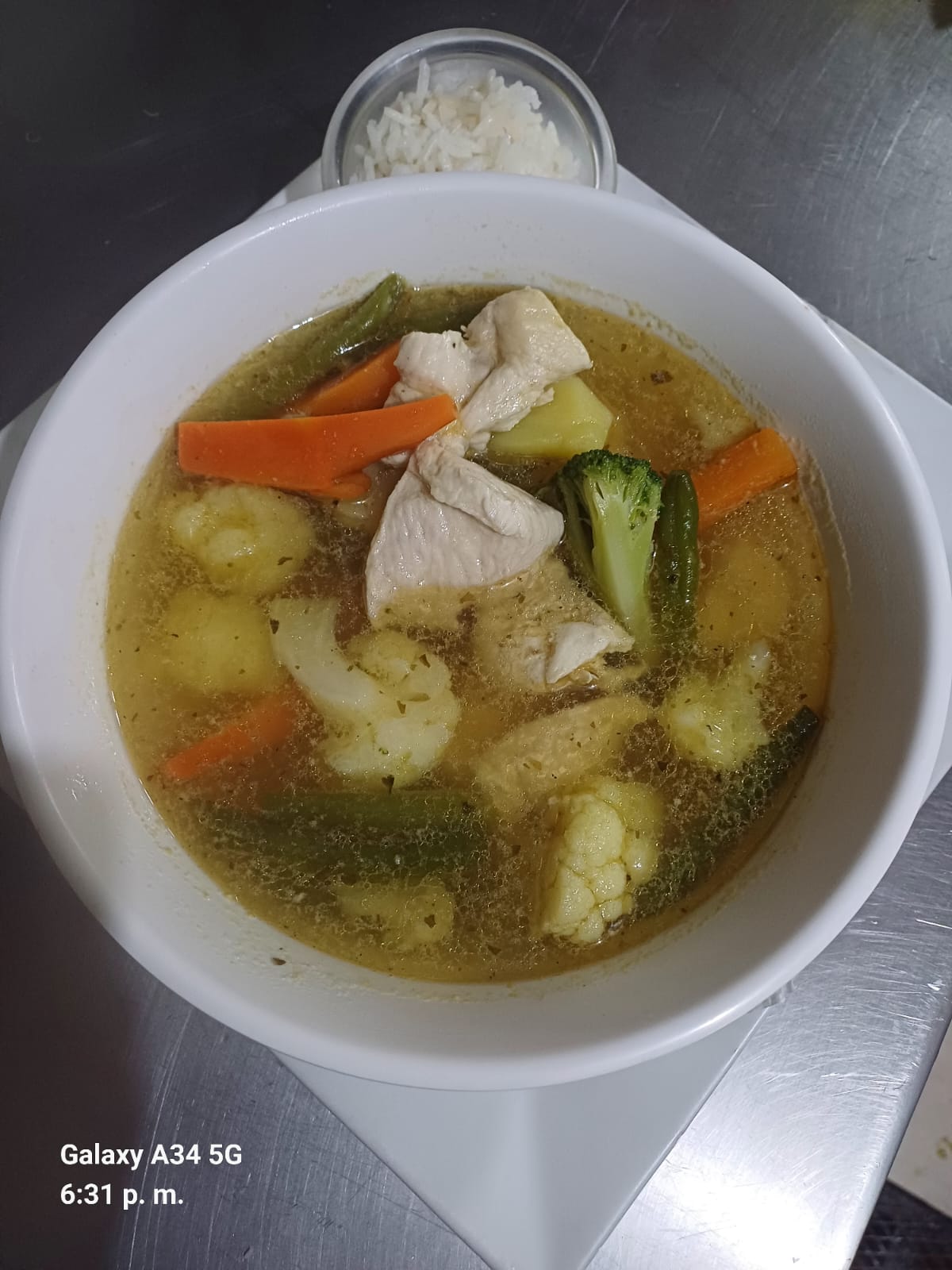 A base de caldo natural de pollo, con verduras mixtas, pollo y arroz.