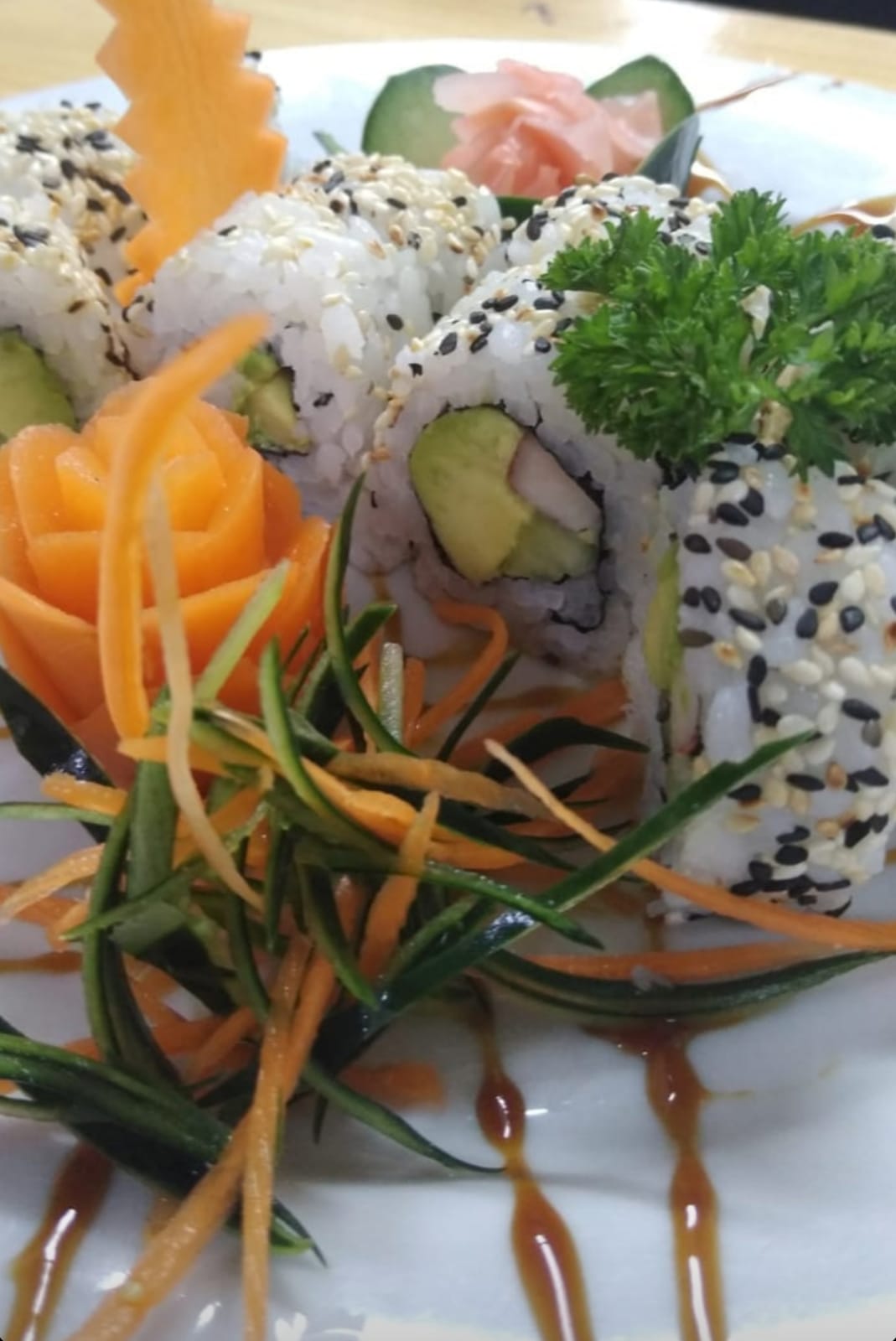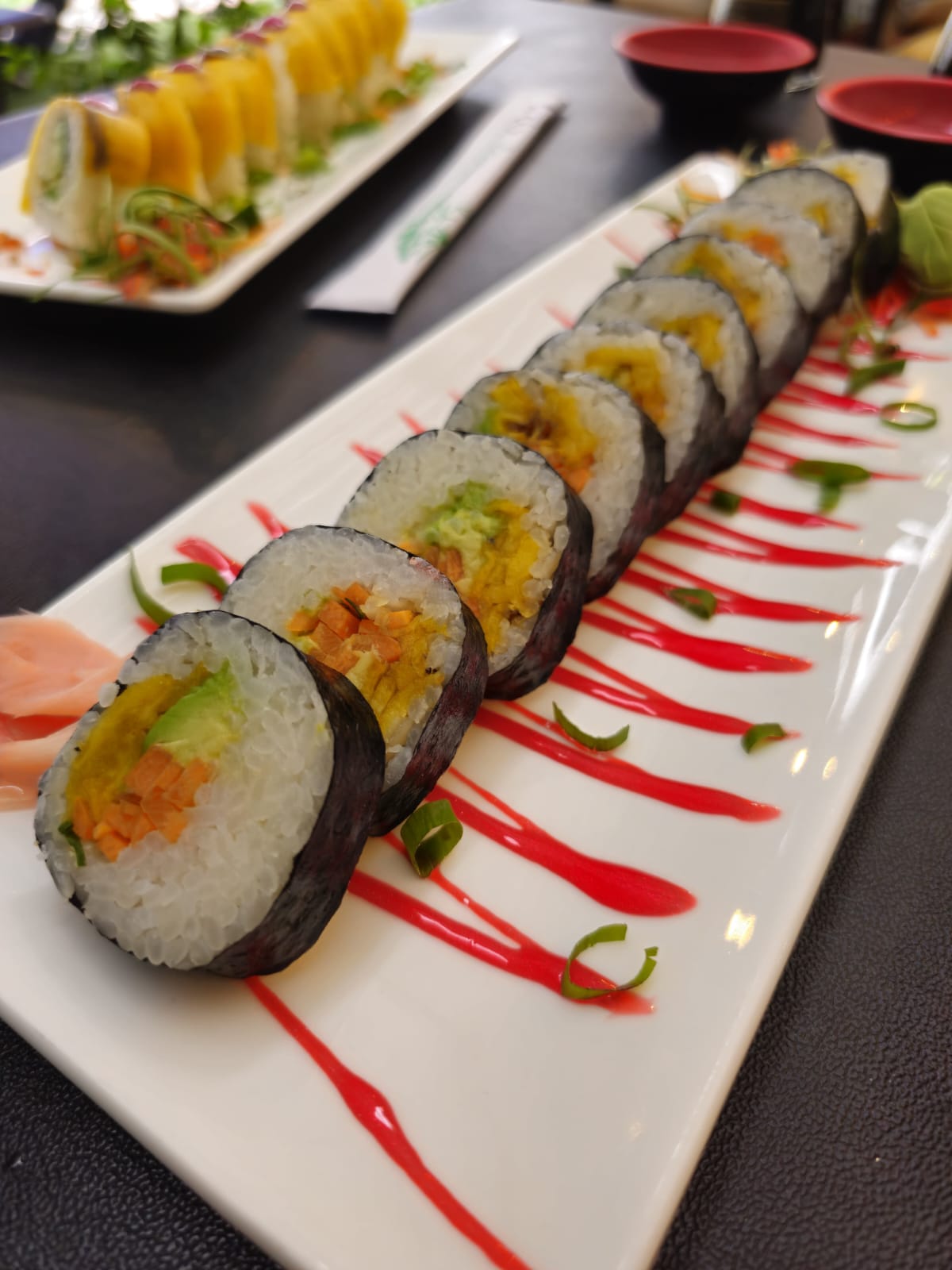 Cubierto de aguacate y relleno de pepino, zanahoria, tradicional roll pero al estilo vegetariano.