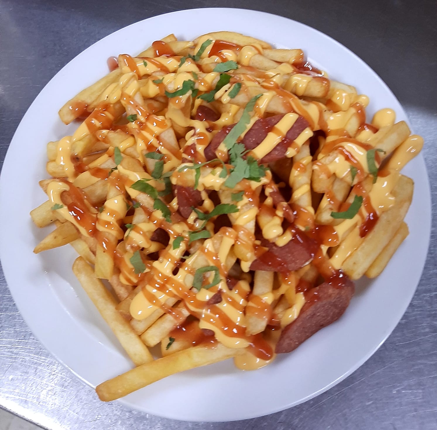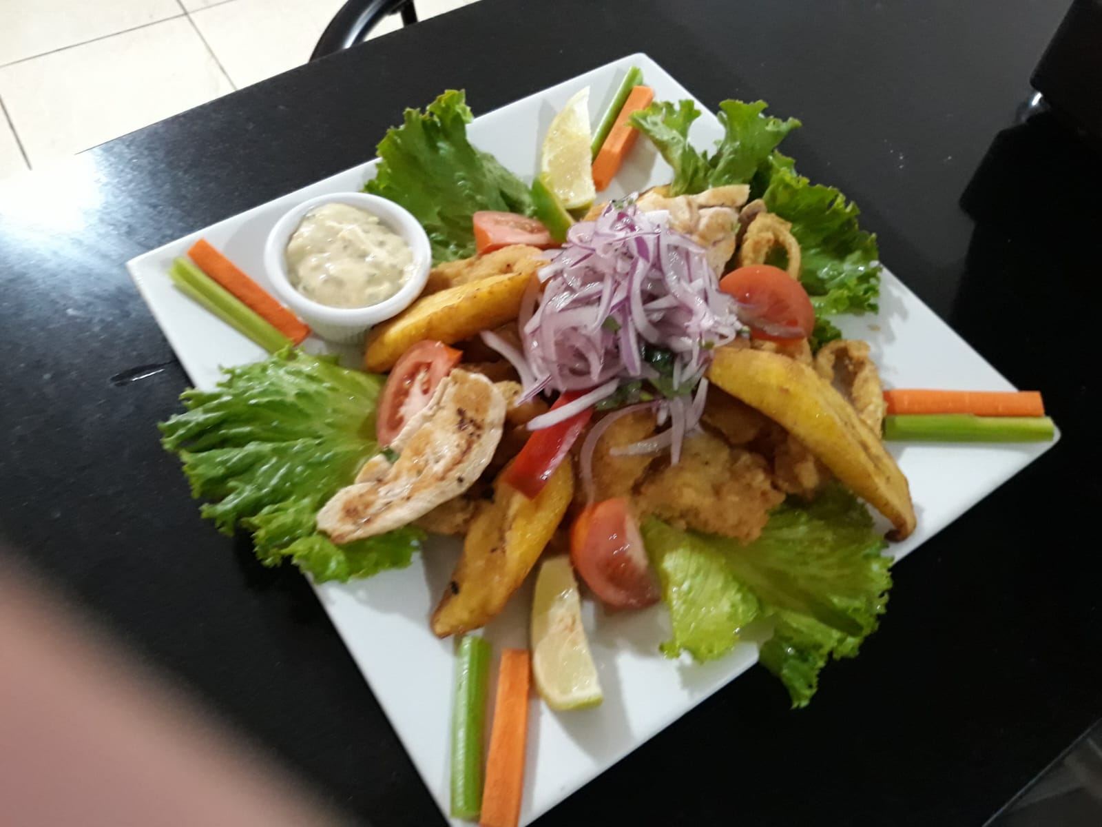 Mariscos, mostaza china, cebollino, chile dulce y huevo con papas francesas y ensalada.