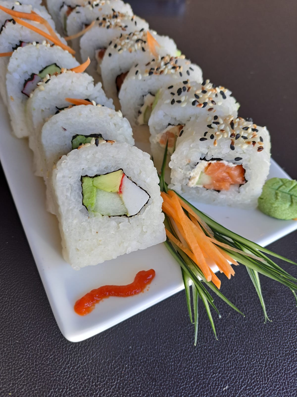 Alga por fuera, relleno de salmón, atún, masago, aguacate, kanikama y pepino.
