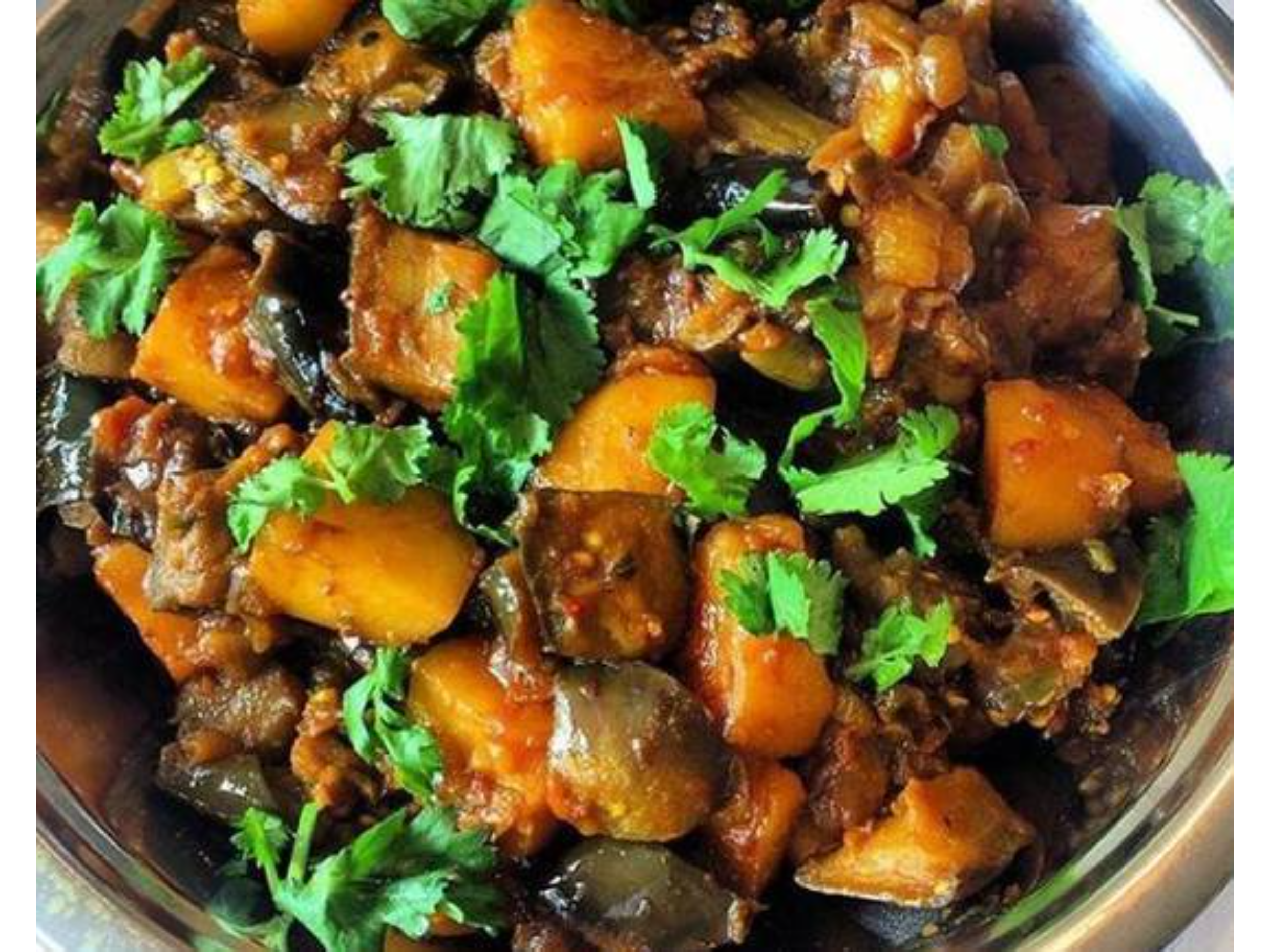 Puré de brenjena cocido con cebolla, tomate, semilla de culantro y arvejas.