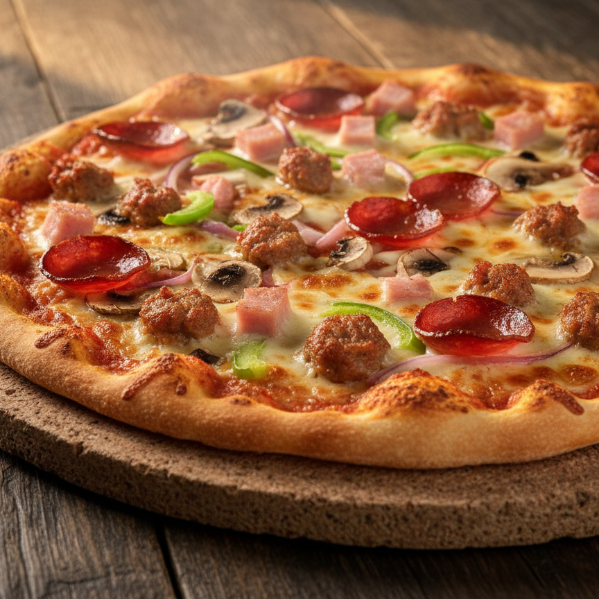 ¡Para los verdaderos amantes de la carne! 🍕 Una explosión de sabor con salchicha italiana, salame, jamón cocido, champiñones frescos, chile dulce y cebolla sobre masa artesanal. 🔥