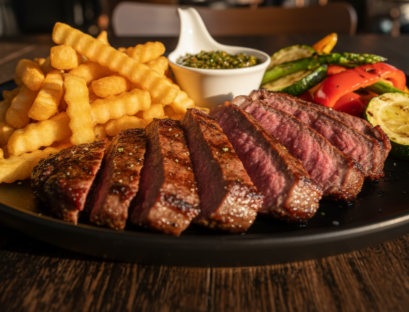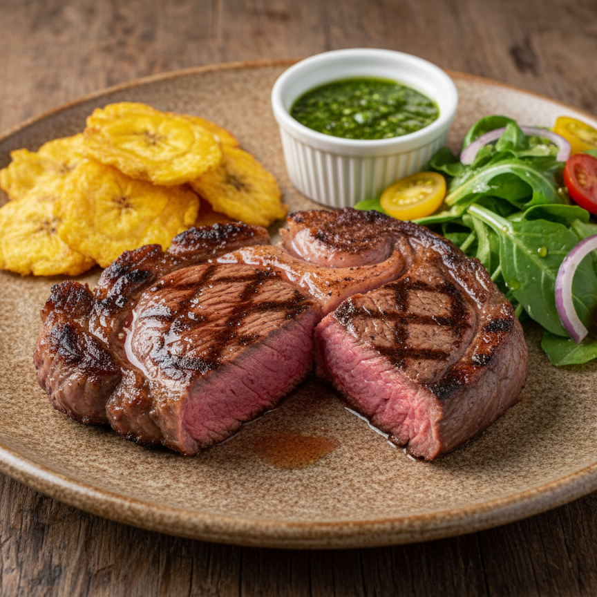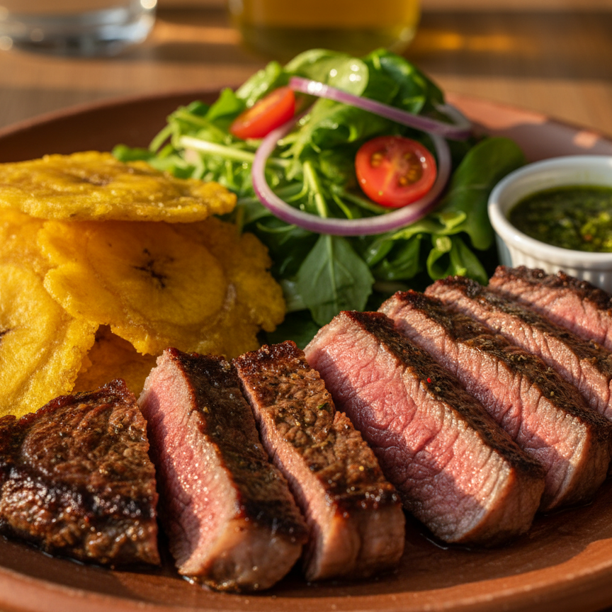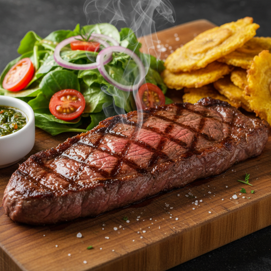 **Churrasco Premium 250g con Acompañamientos a tu Elección** Siente la jugosidad de nuestro corte de churrasco, perfectamente sellado y con el término ideal. Acompañado de una fresca ensalada verde y crujientes patacones, coronado con nuestro chimichurri casero que eleva cada bocado. ¡Una experiencia de sabor inigualable!