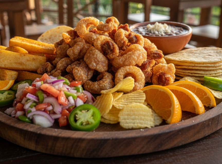 ¡Prepárate para una explosión de sabor con nuestra 'Tabla de Chicharrones'! 🇨🇷 Crujientes chicharrones dorados acompañados de yuca frita perfectamente sazonada, una refrescante ensalada criolla, cremosos frijoles molidos, crujientes chips, un toque picante de jalapeño, tortillas calientitas y la acidez perfecta de la naranjilla. ¡Una fiesta de texturas y sabores en cada bocado!