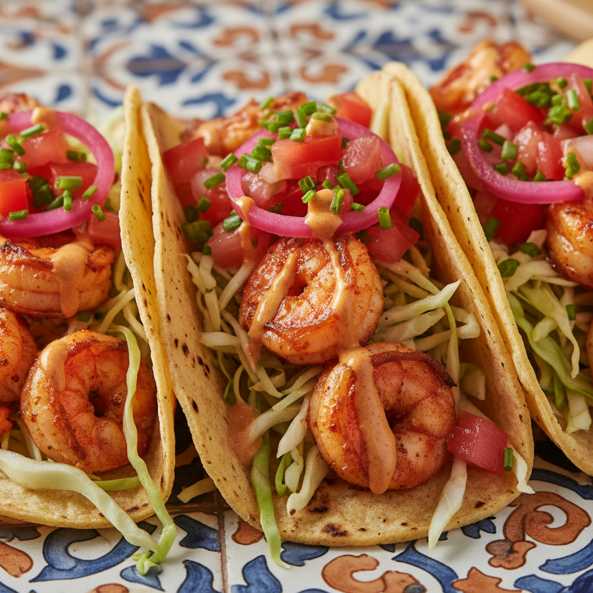 Disfruta de la perfecta combinación de camarones al ajillo sobre tortillas frescas, acompañados de ensalada de repollo, cebolla morada encurtida, pico de gallo, cebollino y el toque picante de nuestra salsa especial de chipotle.