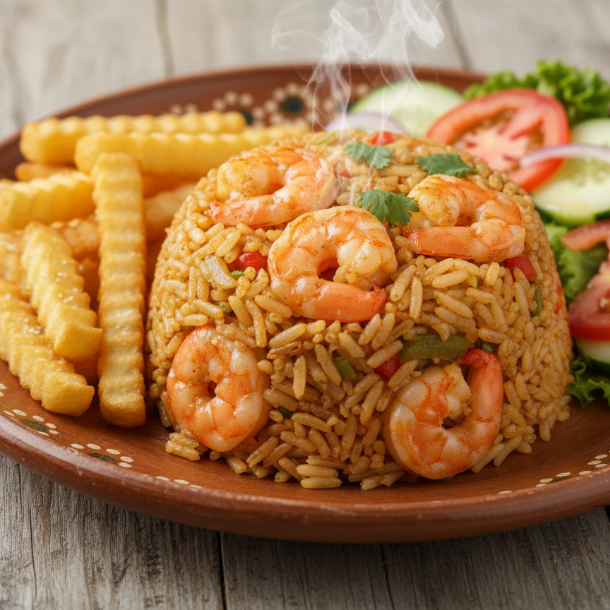 ¡Un festín del mar en tu mesa! 🦐 Arroz perfectamente sazonado con camarones jugosos, servido con papas fritas doraditas y una ensalada fresca de la casa.