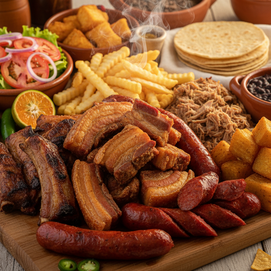 ¡Un festín criollo para compartir! 🇨🇷 Disfruta de chicharrones crujientes, costilla jugosa, chorizo y pulled pork, acompañados de yuca, papas, tortillas y nuestros inconfundibles frijolitos molidos.