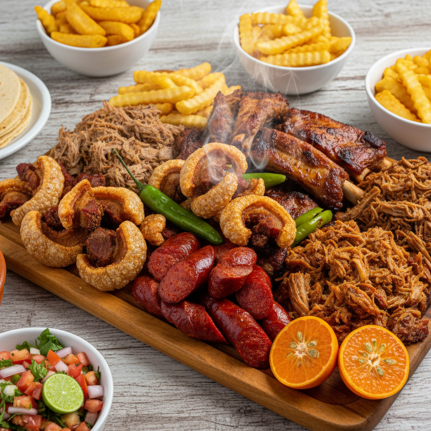 ¡La auténtica fiesta tica en tu mesa! 🇨🇷 Saborea una combinación espectacular de chicharrones crujientes, costilla jugosa, chorizo artesanal y pulled pork. Todo acompañado de yuca y papas fritas, ensalada criolla fresca, frijolitos molidos, tortillas y el toque picante del jalapeño. Ideal para disfrutar en familia o con amigos.