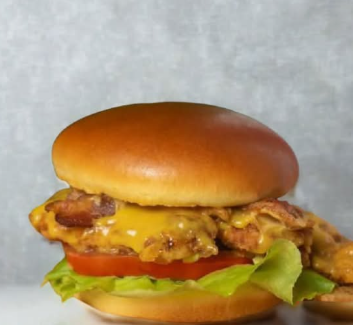 Pan dorado grande torta de carne, delicioso queso cheddar y tocineta con salsas de la casa.