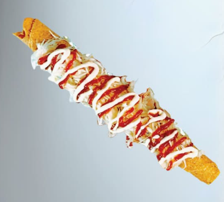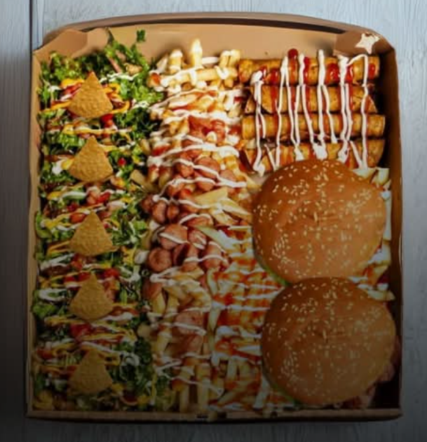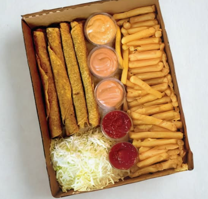 Incluye cuatro tacos ticos con repollo, dos cheese burger y 800 g de salchipapas fritas, una orden de nachos, salsa de tomate y mayonesa.