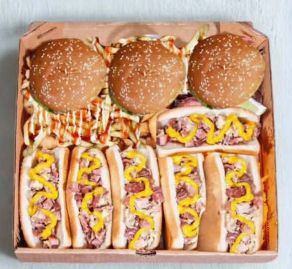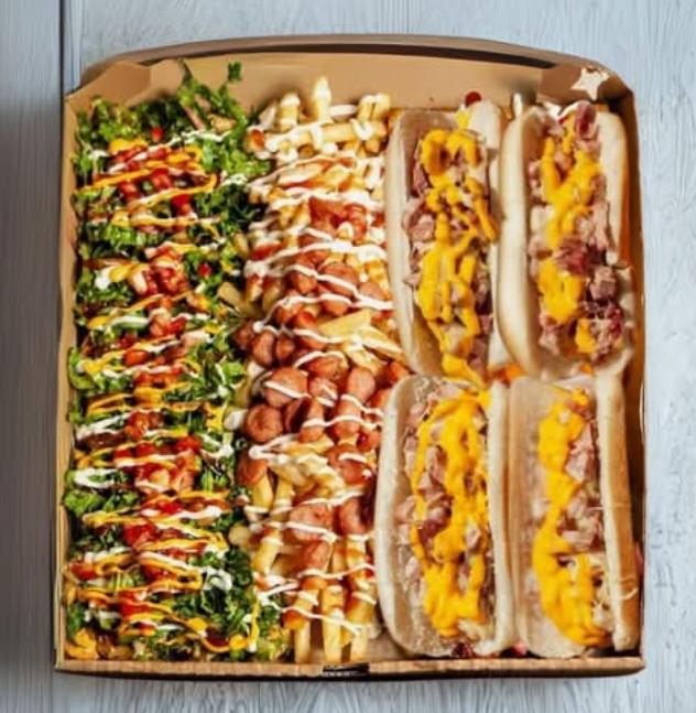 Incluye seis hot dogs (pan, salchicha, repollo y papas en borona), tres cheese burger y 500 g de papas fritas con especies, salsa de tomate y mayonesa.