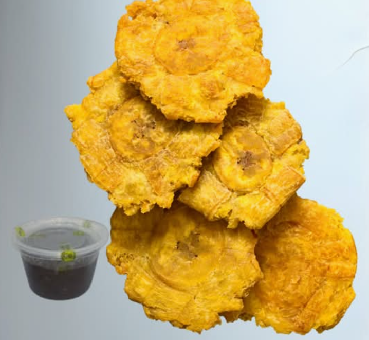 5 Patacones con un dip de frijol molido.