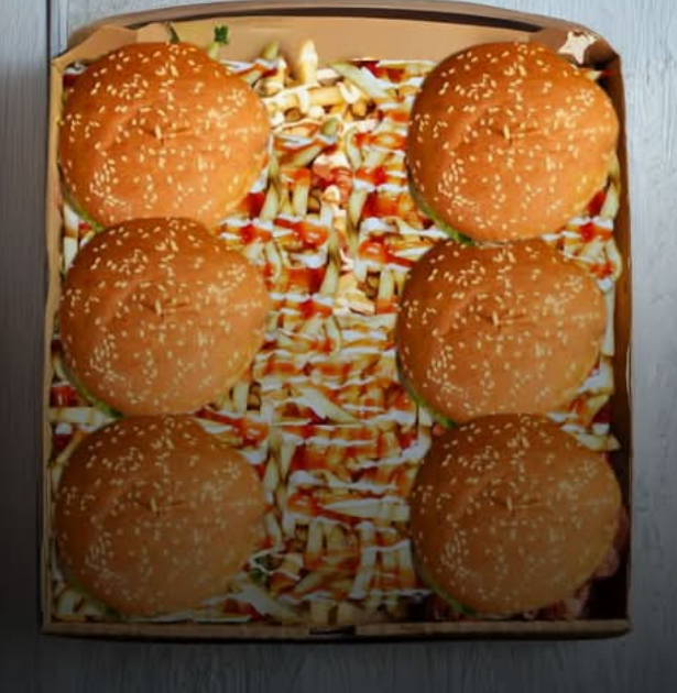 Incluye seis hamburguesas de cheese, 500 g de papas fritas con especies, salsa de tomate y mayonesa.