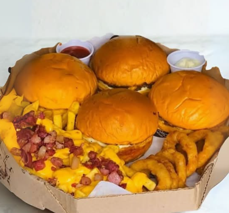 Incluye cuatro hamburguesas grandes cheese bacon , 500 g de papas fritas con tocineta y queso derretido, 8 aros de cebolla, salsa de tomate y mayonesa.