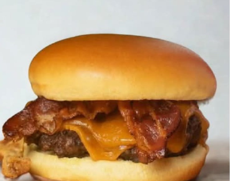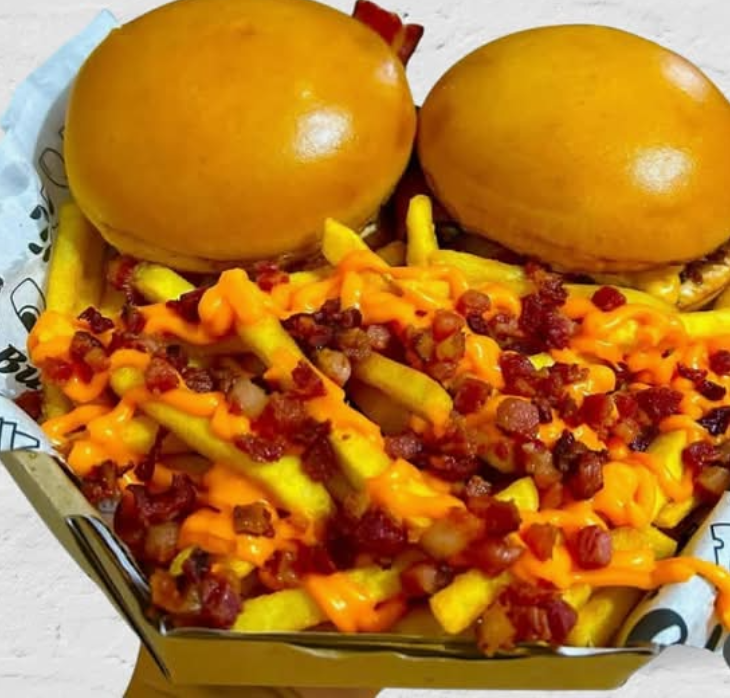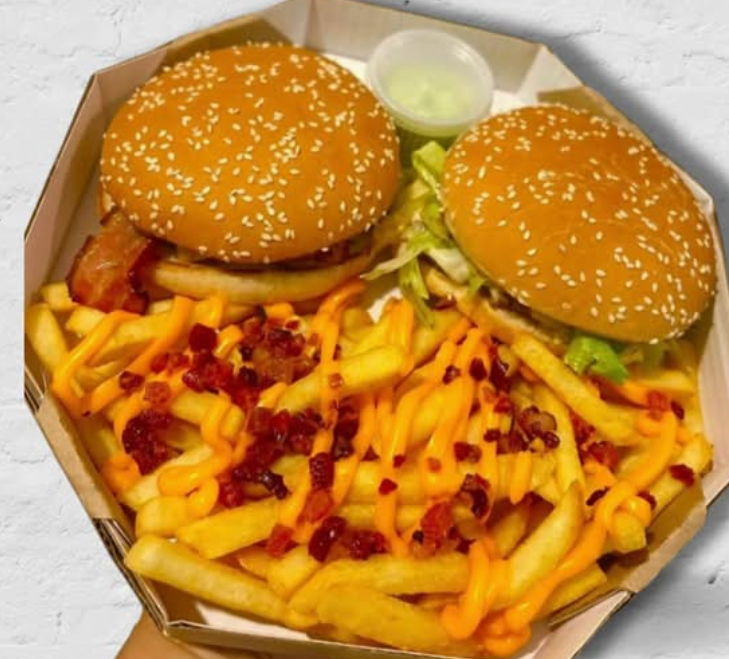 Dos hamburguesas grandes Cheesse Bacon y 500 g de papas con tocino y queso.