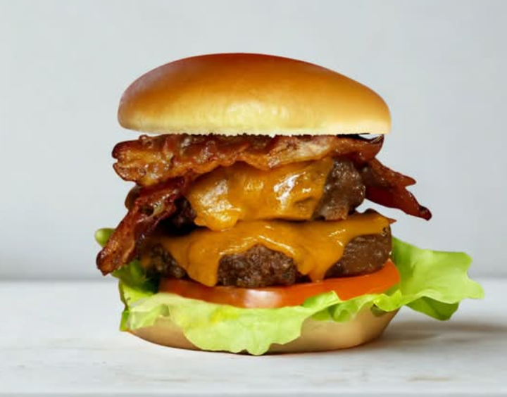Doble torta, 3 tocinetas, queso cheddar, salsa americana, tomate, lechuga y pepinillos dulces.