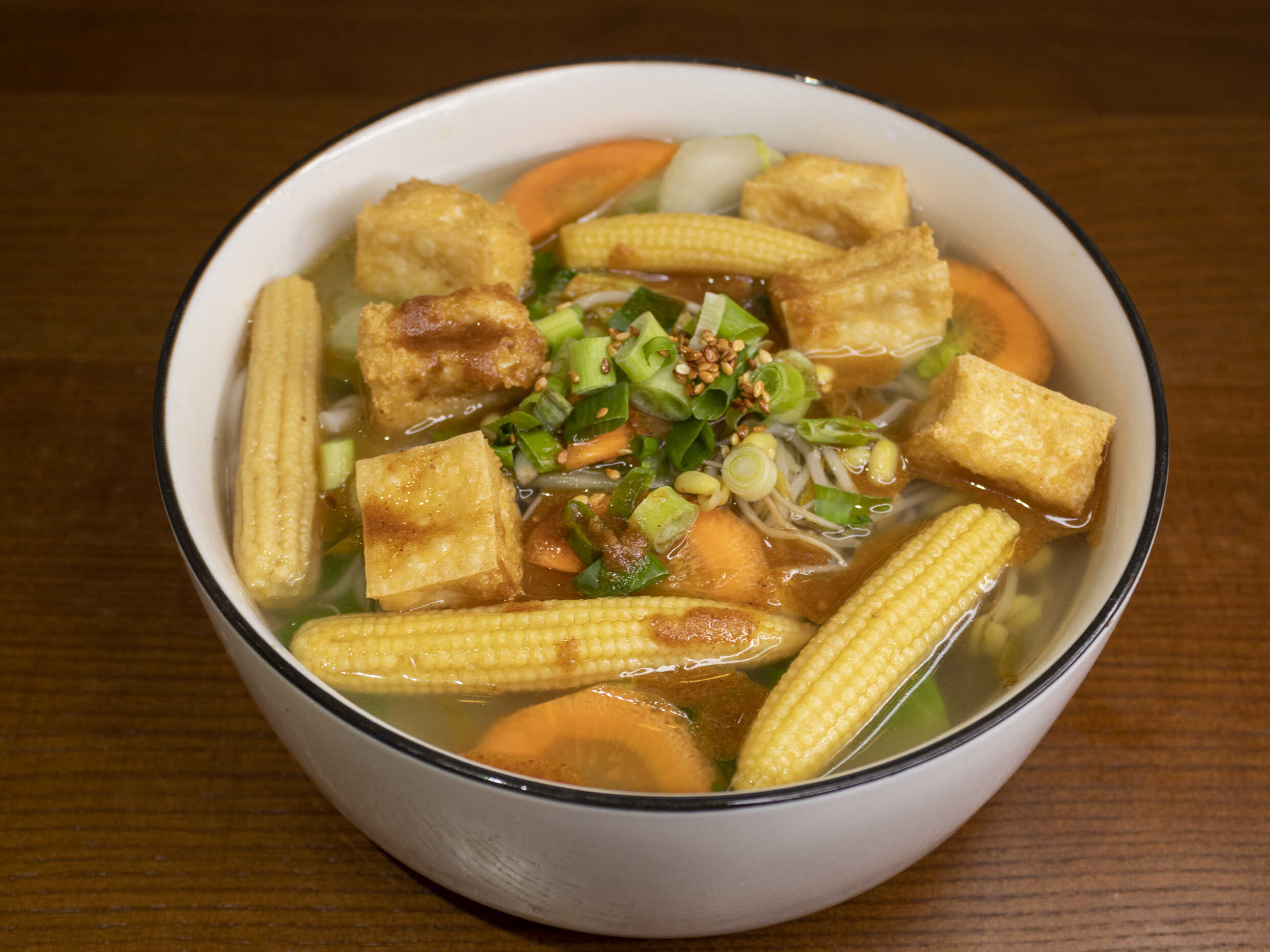 Sopa con mostaza,chayote, aceite de ajonjoli, frijol nacido, zanahoria, cebollin, mini elotitos, y pedacitos de tofu frito.