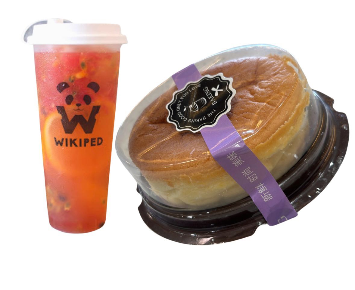 Bebida a base de té verde, sandia y maracuya, decorada con trocitos de piña, rodajas de naranja y topping de cristal boba. Tamaño de 700 ml + 1 Mini Cheesecake Japonés