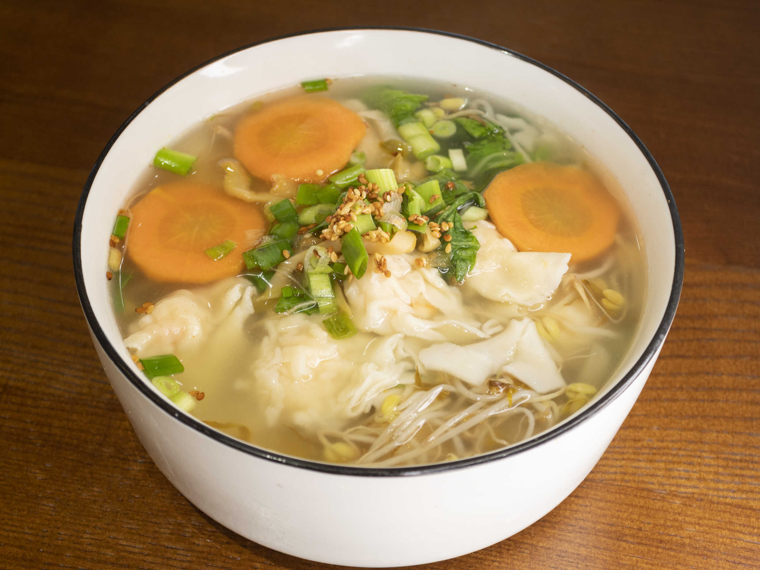 Sopa con mostaza, aceite de ajonjoli, frijol nacido, chayote, zanahoria, cebollin, fideos de tallarin, wantan rellenos de cerdo y hongos.