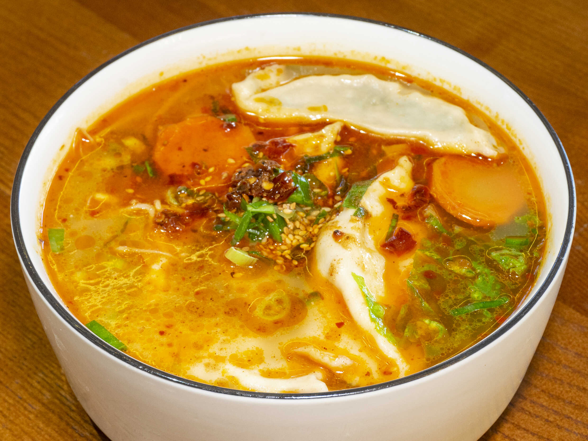 Sopa con mostaza, aceite de ajonjoli, frijol nacido, zanahoria, chayote, cebollin, dumplings rellenos de carne de cerdo y cebollin chino picante