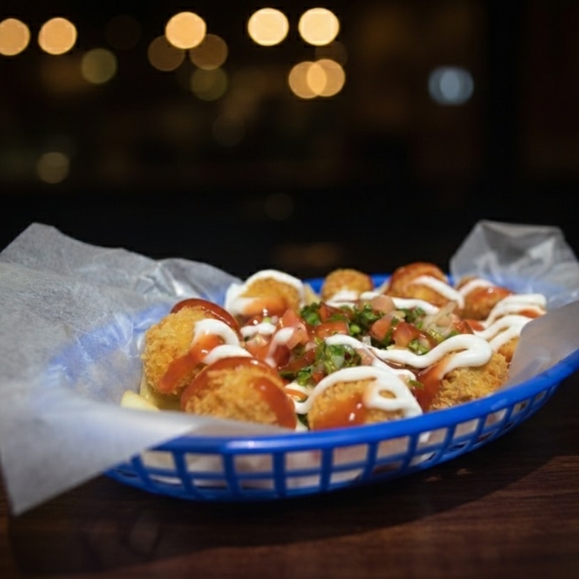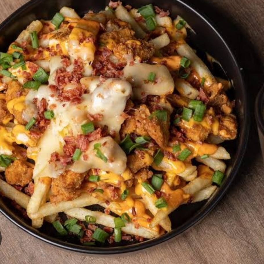 Papas fritas, queso mozzarella, crisper de pollo.