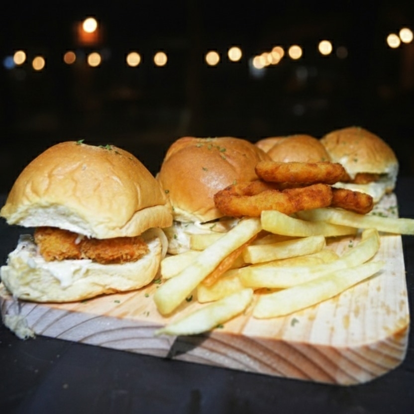 4 Mini hamburguesas de pan bit con pechuguita de pollo empanizada, queso mozzarella, tocineta y cebolla crispy. Acompañadas con papas fritas.