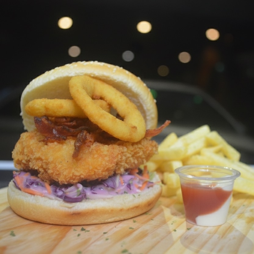 Hamburguesa con pechuga de pollo empanizada, sobre una base de ensalada de repollo dulce, gratinada con queso blanco y aros de cebolla con salsa de la casa. Acompañadas con papas fritas.
