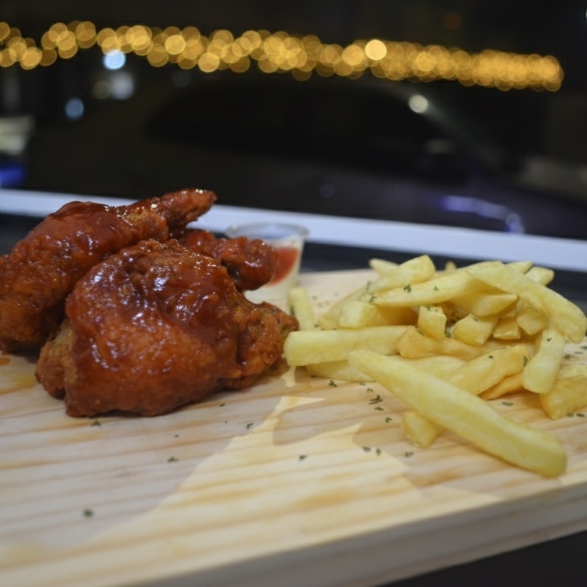 15 Alitas acompañadas con papas fritas y salsa a elegir.