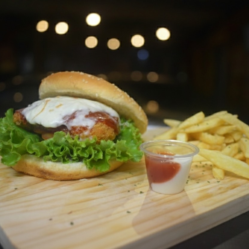 Hamburguesa con pechuga de pollo empanizada, salsa BBQ, lechuga, tomate y queso. Acompañadas con papas fritas.