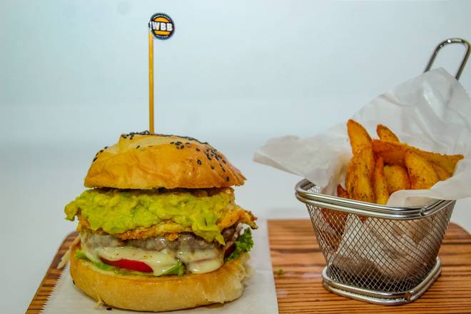 Lechuga, tomate, torta, queso mozarella, fucamole y huevo frito. Acompañada de papas fritas