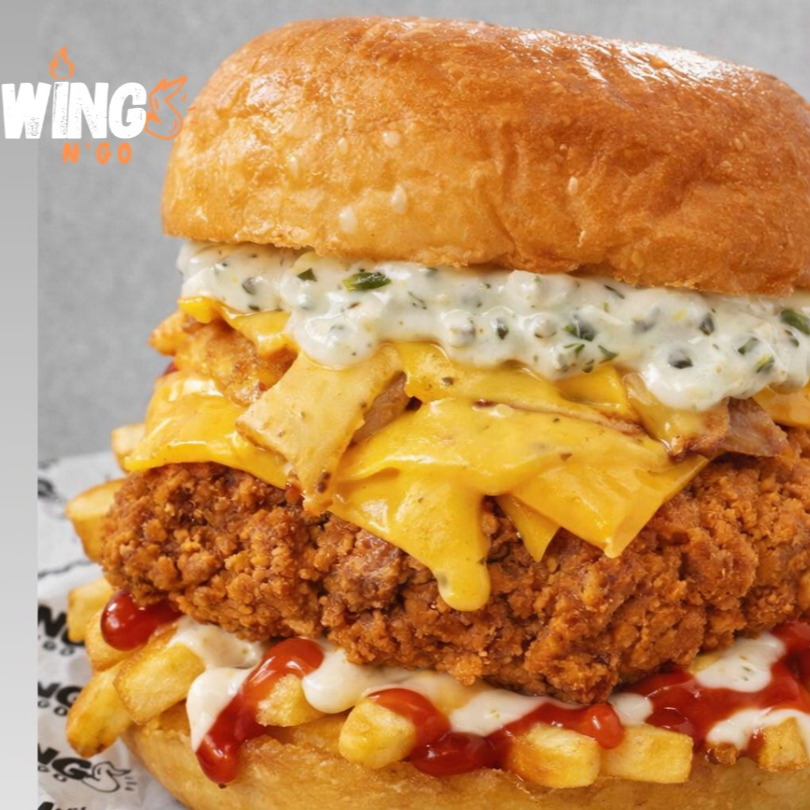 Hamburguesa de pollo empanizado, bañada en salsa de queso fundido y la salsa que elijas (¡recomendamos tártara!). Viene cargada con papas dentro del pan!!