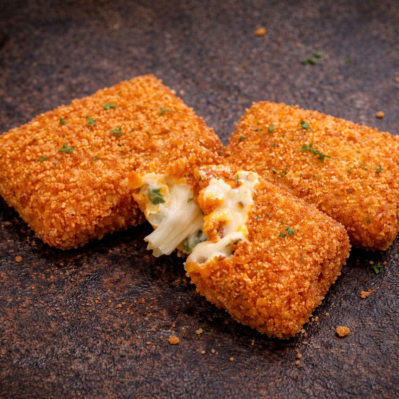 Trozos de queso mozzarella empanizados, dorados hasta quedar crujientes por fuera y ultra derretidos por dentro. Bañados con la salsa que elijas. Pero si nos preguntás, la respuesta siempre es Sweet Chili 🔥