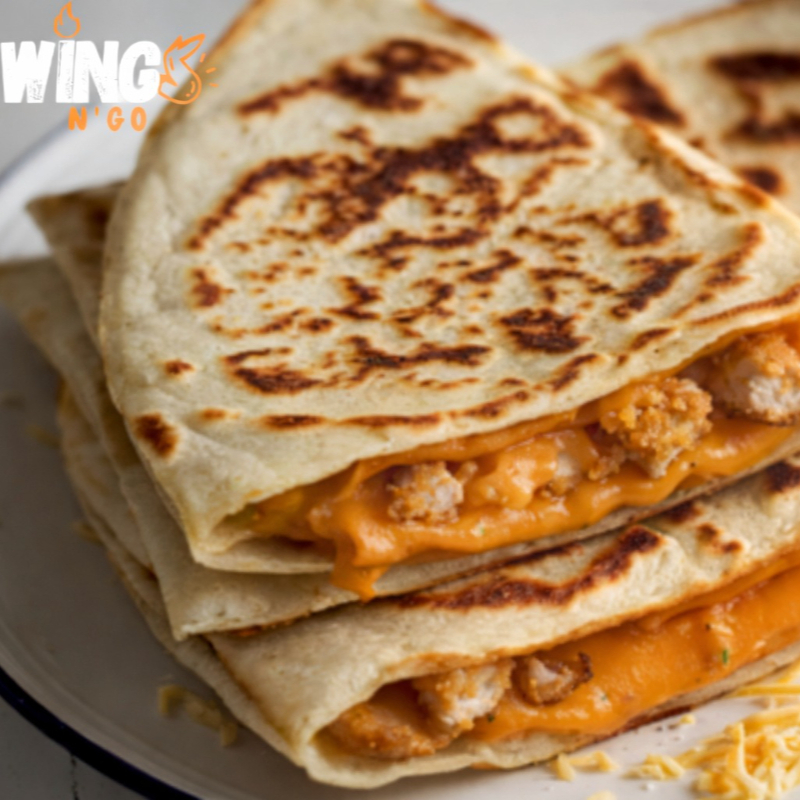 Tortilla dorada rellena con nuggets de pollo empanizados, mozzarella derretido y tu salsa favorita (Buffalo, BBQ, Cheddar). ✨