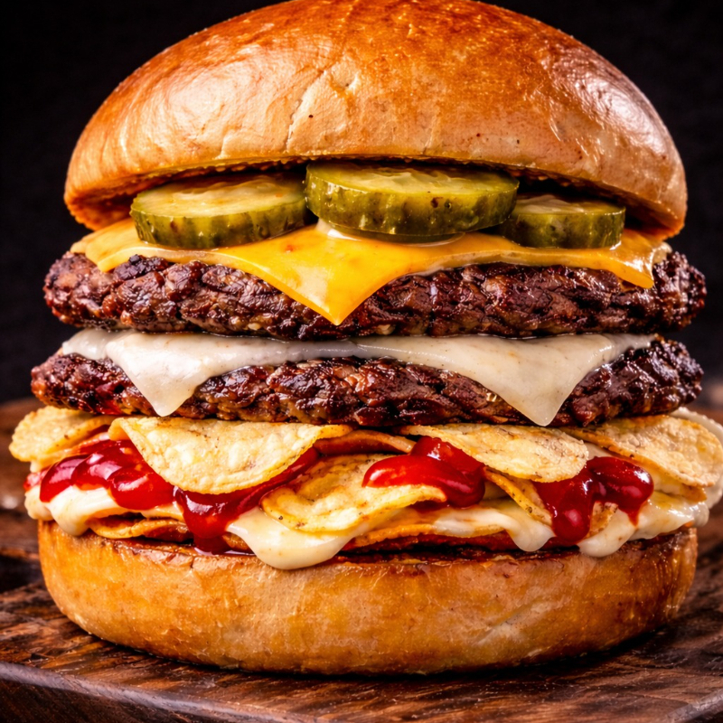 Doble carne 100% jugosa, queso Cheddar, pepinillos, extra de mozzarella y pan dorado con mantequilla, papas tostadas. 🔥Esto no es una hamburguesa, es una declaración de guerra contra el hambre.