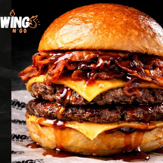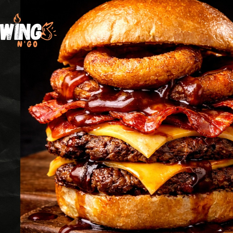 Doble carne jugosa, doble queso Cheddar derretido, tocino rebanadas, aros de cebolla, la BBQ de la casa y pan sellado con mantequilla. Sin verduras, sin cuentos. Solo lo que importa: carne, queso, tocino y aros.