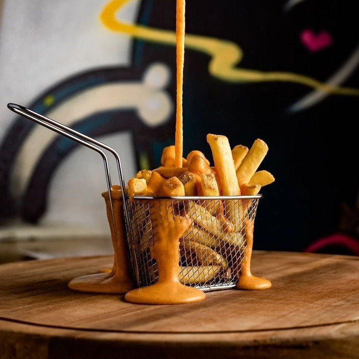 Cama de papas doradas, bañadas con salsa de tomate y mayonesa de la casa, coronadas con trozos de pollo empanizado o carne 100% jugosa, tocino crujiente y lluvia de salsa de queso Cheddar derretido, más la salsa que prefieras. ¿Puedes resistirte?.